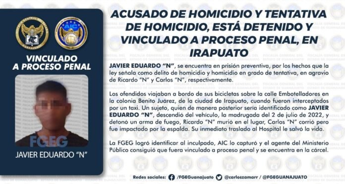 Los ofendidos viajaban a bordo de sus bicicletas sobre la calle Embotelladores en la colonia Benito Juárez, de la ciudad de Irapuato, cuando fueron interceptados por un taxi. Un sujeto, quien de manera posterior sería identificado como JAVIER EDUARDO «N», descendió del vehículo, la madrugada del 2 de julio de 2022, y detonó un arma de fuego, Ricardo «N» murió en el lugar, Carlos «N» corrió pero fue impactado por la espalda. Su inmediato traslado al Hospital le salvó la vida.