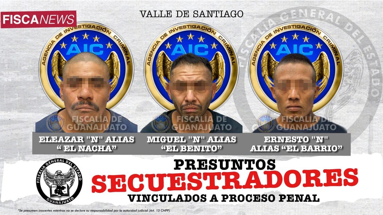 Una vez en audiencia de control, el Juez calificó de legal la detención y en subsecuente, el Agente del Ministerio Público formuló imputación a ERNESTO “N”, alias “El Barrio”, de 33 años MIGUEL “N”, alias “El Benito”, de 31 años y a ELEAZAR “N”, alias “La Nacha”, de 39 años, como presuntos responsables de los delitos de secuestro agravado y robo equiparado, mientras que el adolescente fue canalizado a la Unidad Especializada en Justicia para Adolescentes.