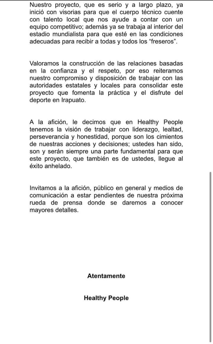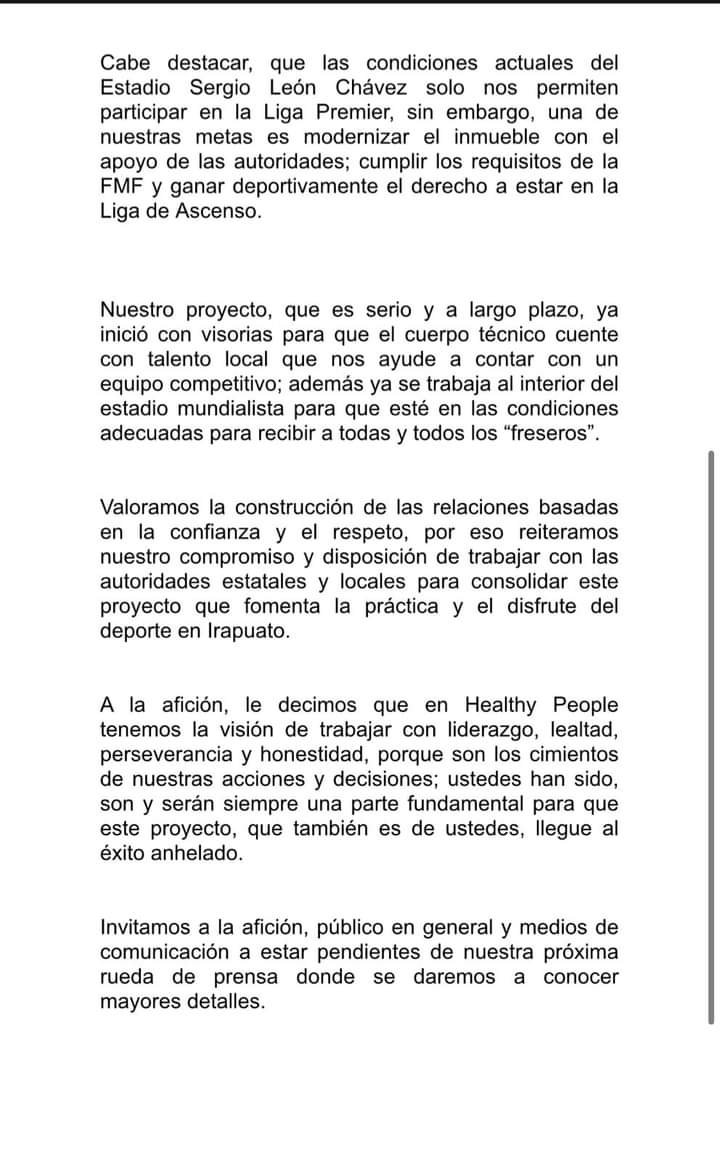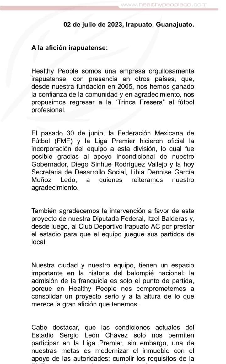 Después de que el Club Irapuato A. C., diera a conocer el pasado 30 de junio que regresaba el equipo a la Liga Premier, la empresa Healthy People se pronunció y reconoció el apoyo que se le dió para poder llevar a cabo este regreso.
