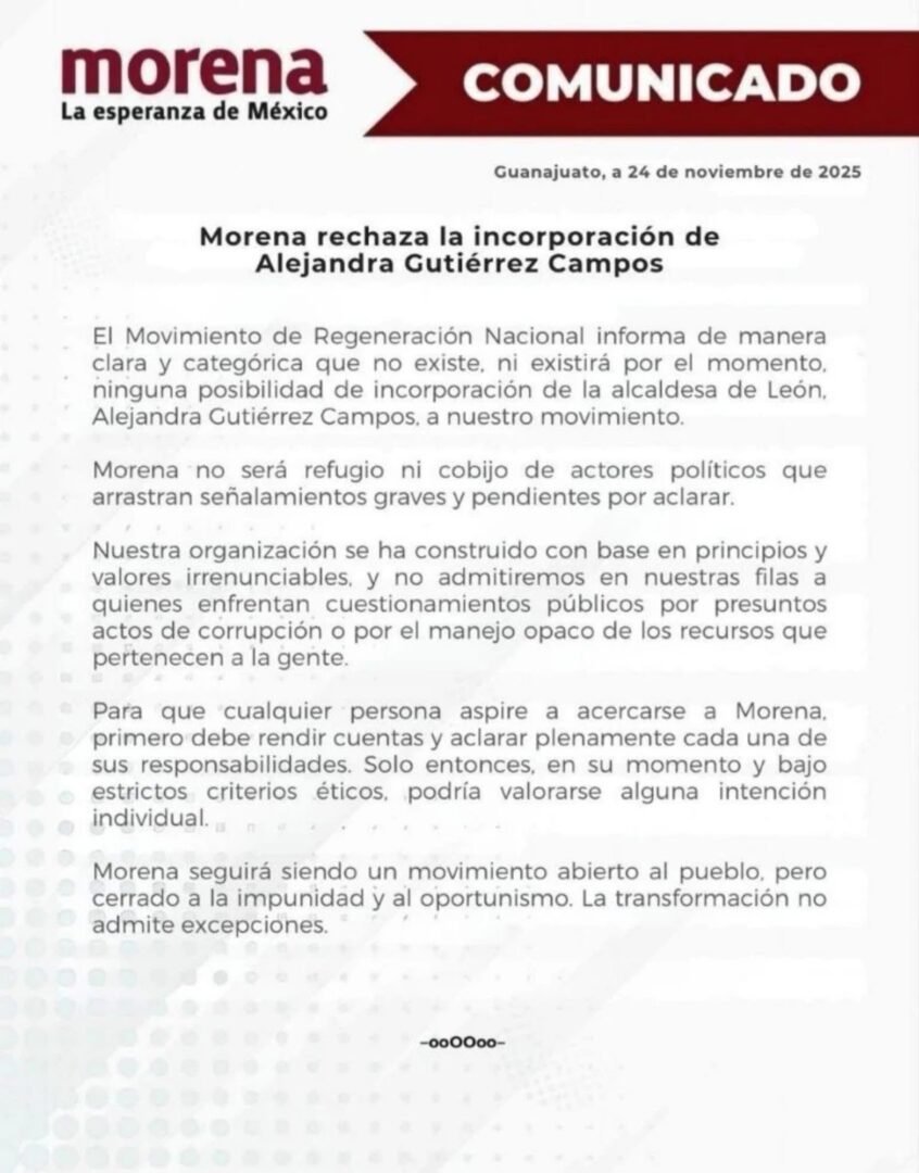 Sin embargo, el secretario del partido, Jesús Ramírez Garibay, desmintió rápidamente la autenticidad del texto. La dirigencia de Morena aclaró que el comunicado era falso y aseguró que, por el momento, “no existe, ni existirá por el momento ninguna posibilidad de incorporación de la alcaldesa de León a su movimiento”.
