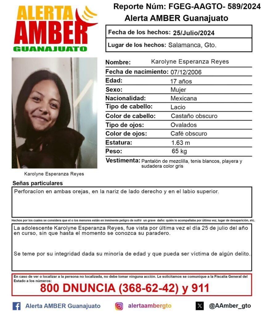 Salamanca.- Fue activada la Alerta AMBER Guanajuato de la Adolescente Karolyne Esperanza Reyes de 17 años de edad, de este municipio y autoridades solicitaron la colaboración de la ciudadanía para localizarla.