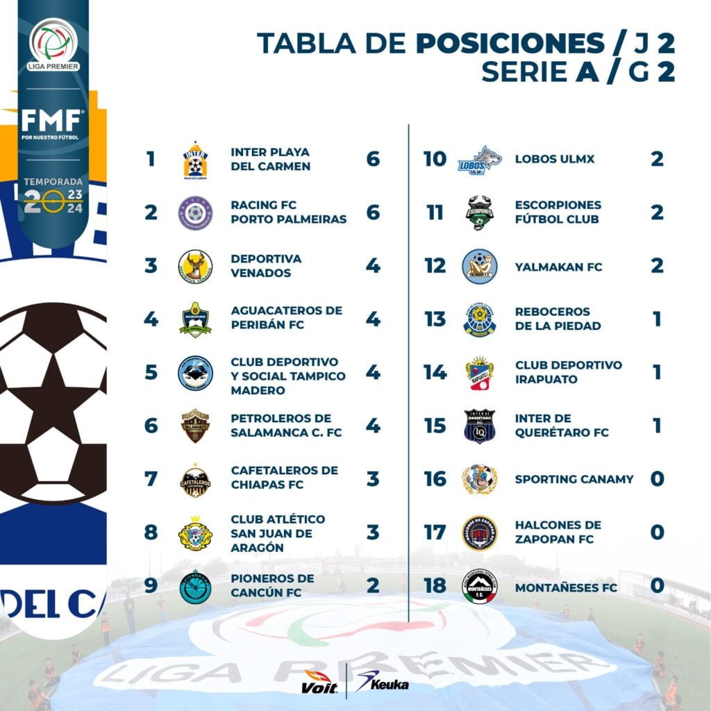 Después de que terminara oficialmente la Jornada 2 de la Liga Premier, se apuntalan algunos de los equipos de reciente nacimiento como lo es el equipo de RACING FC PORTO PALMEIRAS el cuál se coloca en el primer puesto con 6 Unidades, compartiendolo con Inter Playa del Carmen.
