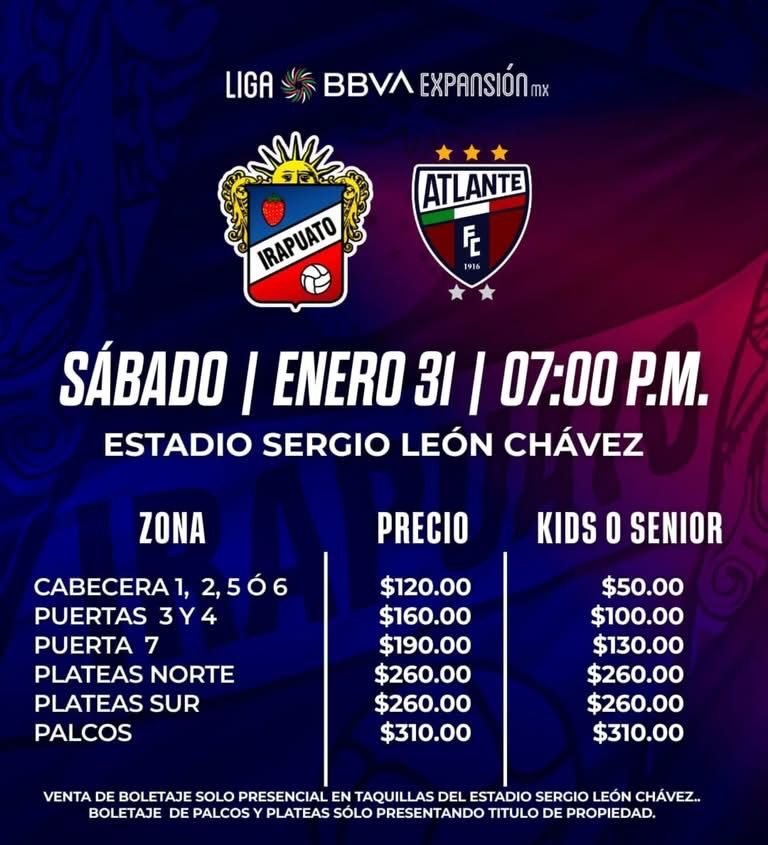 A través de sus redes sociales, el Club Irapuato informó de manera oficial el inicio de la venta de boletos para el partido correspondiente a la Jornada 4 de la Liga de Expansión MX, donde la Trinca Fresera recibirá al Atlante en el Estadio Sergio León Chávez.