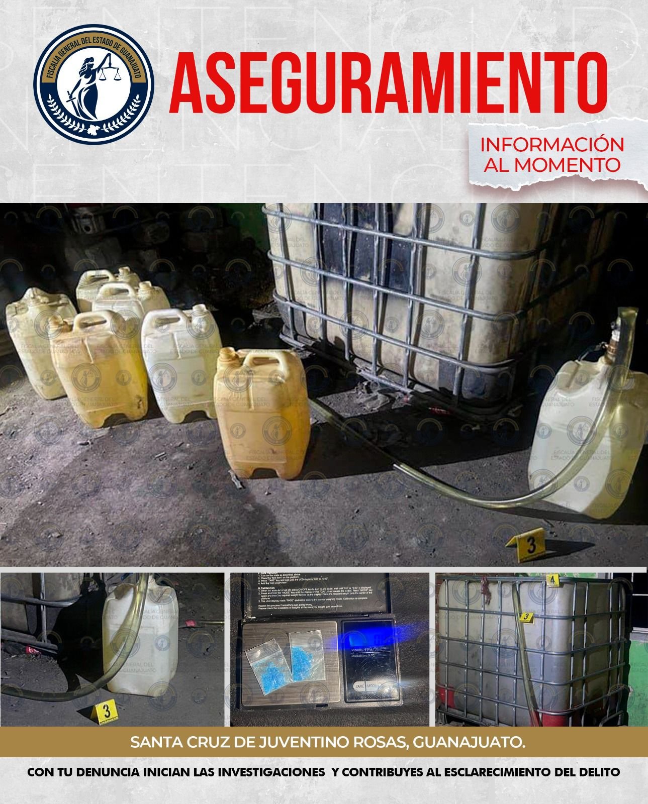 La Fiscalía General del Estado de Guanajuato aseguró aproximadamente 600 litros de hidrocarburo durante un cateo realizado en un inmueble de la comunidad de Pozos, como parte de una investigación por presuntas actividades ilícitas relacionadas con el manejo ilegal de combustible.