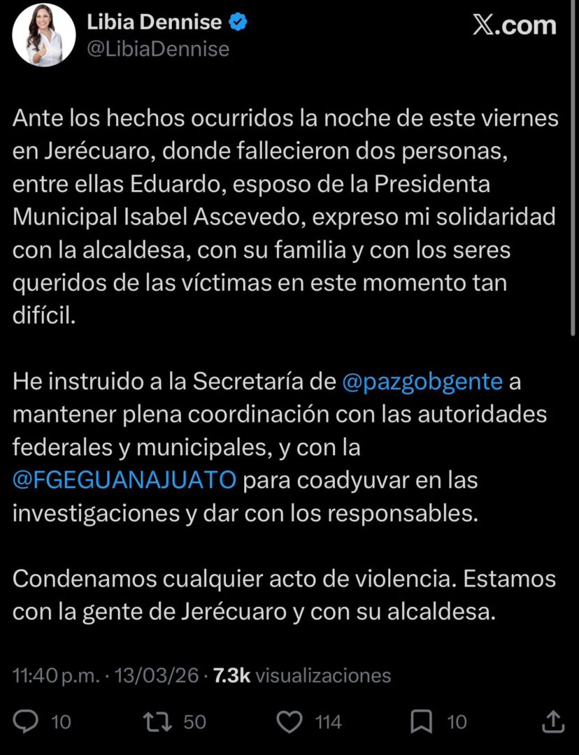 Poco antes de la medianoche, la gobernadora de Guanajuato, Libia Dennise García Muñoz Ledo, expresó su solidaridad con la alcaldesa y con la población de Jerécuaro a través de redes sociales.