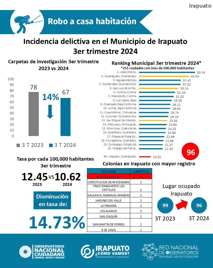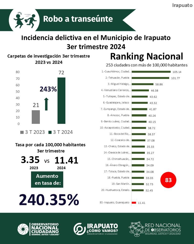 En el último trimestre, Irapuato ha registrado un preocupante incremento en delitos de alto impacto. Según el reporte compartido por el Observatorio Ciudadano Irapuato ¿Cómo Vamos?, los robos con violencia aumentaron un 69%, con más de quinientas denuncias entre julio y septiembre, lo que coloca a la ciudad en el lugar 25 a nivel nacional, con una tasa de 89.20 robos violentos por cada cien mil habitantes.