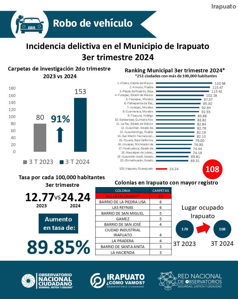Además, el robo de vehículos presentó un aumento del 91%, con 153 casos reportados, elevando a Irapuato al lugar 108 en el país en este tipo de delitos. Las zonas más afectadas por este delito fueron la “Zona Dorada” y la zona de hospitales, áreas con una alta incidencia de robos de autos.