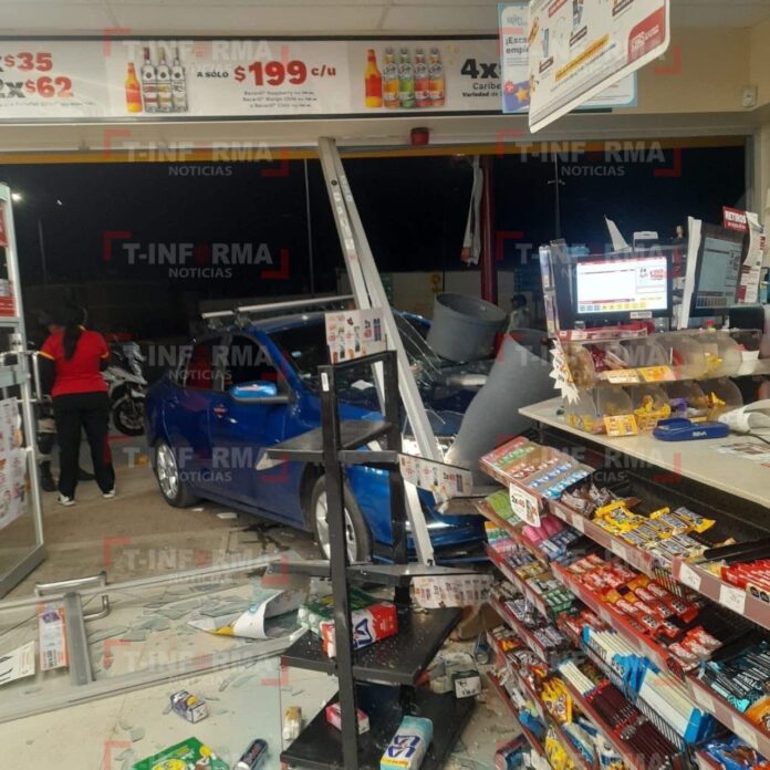 Un automóvil terminó al interior de una tienda de conveniencia tras impactarse contra la fachada del establecimiento la noche del jueves, en hechos ocurridos en la colonia Purísima del Jardín, cerca del fraccionamiento San Javier.