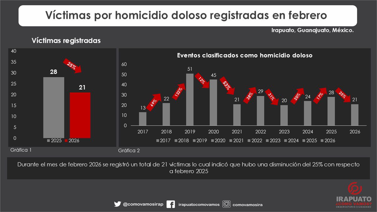 Irapuato registró 21 víctimas de homicidio doloso durante febrero de 2026, lo que representa una disminución del 25% en comparación con el mismo mes del año pasado, cuando se contabilizaron 28, de acuerdo con el más reciente informe del Observatorio Ciudadano Irapuato ¿Cómo Vamos?.