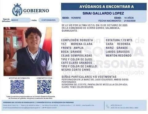 El primer caso corresponde a Sinaí Gallardo López, de 16 años de edad, quien fue visto por última vez el 15 de octubre en la comunidad de Cerro Gordo. Al momento de su desaparición, vestía una sudadera del CECYTE, pantalón de mezclilla azul claro y tenis negros. Como señas particulares, tiene una perforación en el lado izquierdo de la nariz y en ambos oídos.