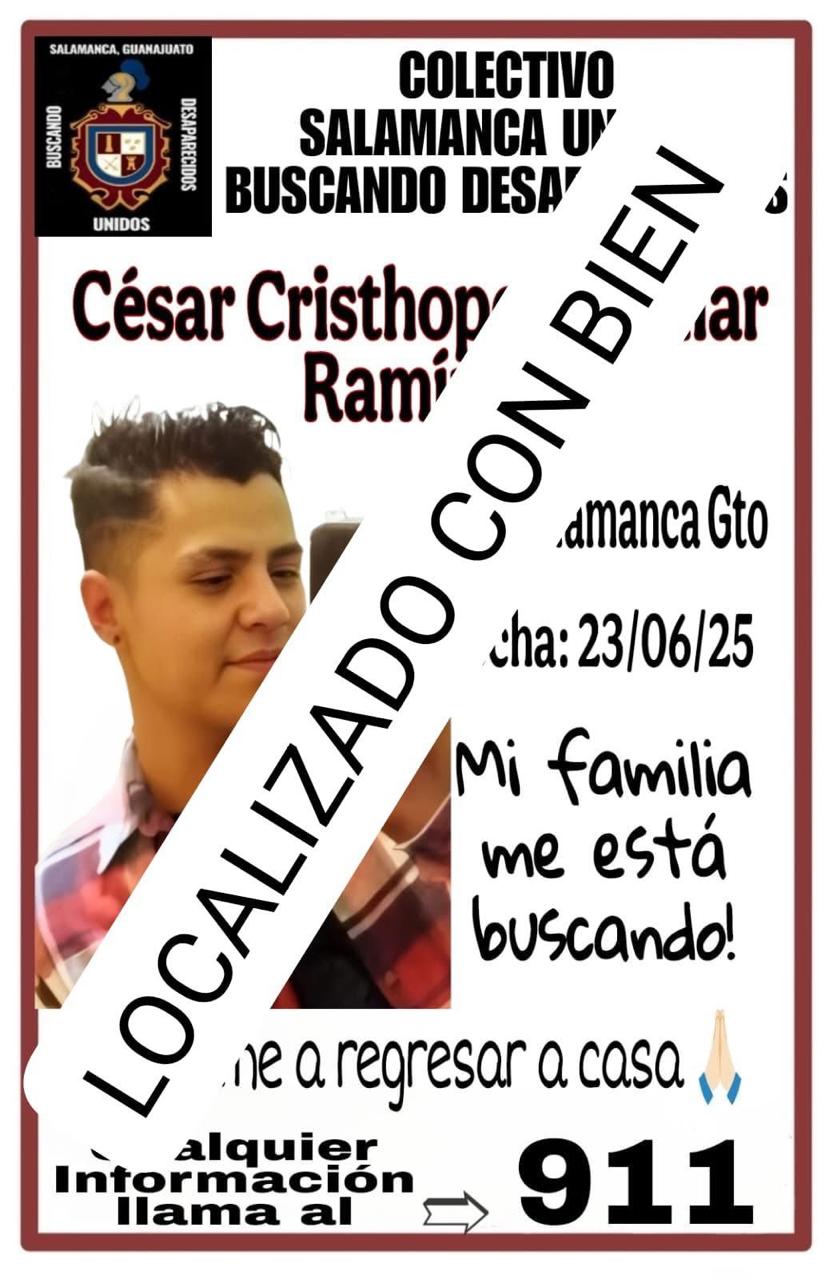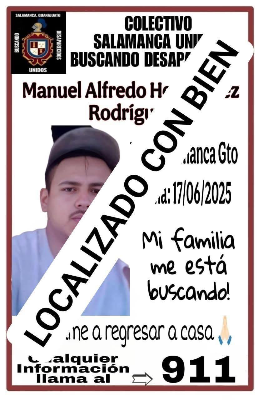 Por su parte el colectivo de búsqueda de desaparecidos, Salamanca Unidos Buscando Desaparecidos, dio a conocer en su cuenta oficial de Facebook que las personas de nombres, Manuel Alfredo Hernandez Rodríguez reportado como desaparecido el 17 de junio del 2025 así como César Christopher N. también reportado como no localizado, el 23 de junio de este año, fueron localizados con bien.