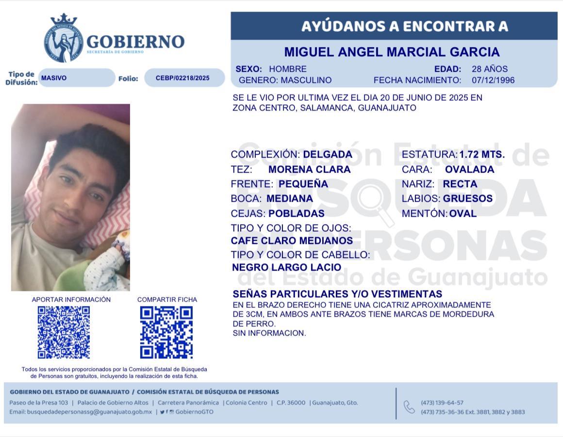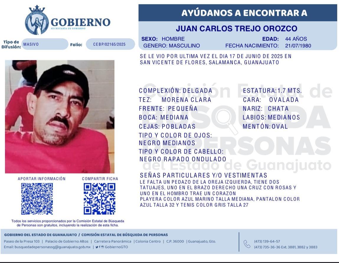 La Secretaria de Seguridad y Paz, compartió las fichas de búsqueda de las siguientes personas : Juan Carlos Trejo de 44 años, visto por última vez en la comunidad San Vicente de Flores el 17 de junio del presente año, Miguel Ángel Marcial Garcia de 28 años, quien fue visto por última vez el 20 de junio del 2025, en la zona centro de esta ciudad de Salamanca.