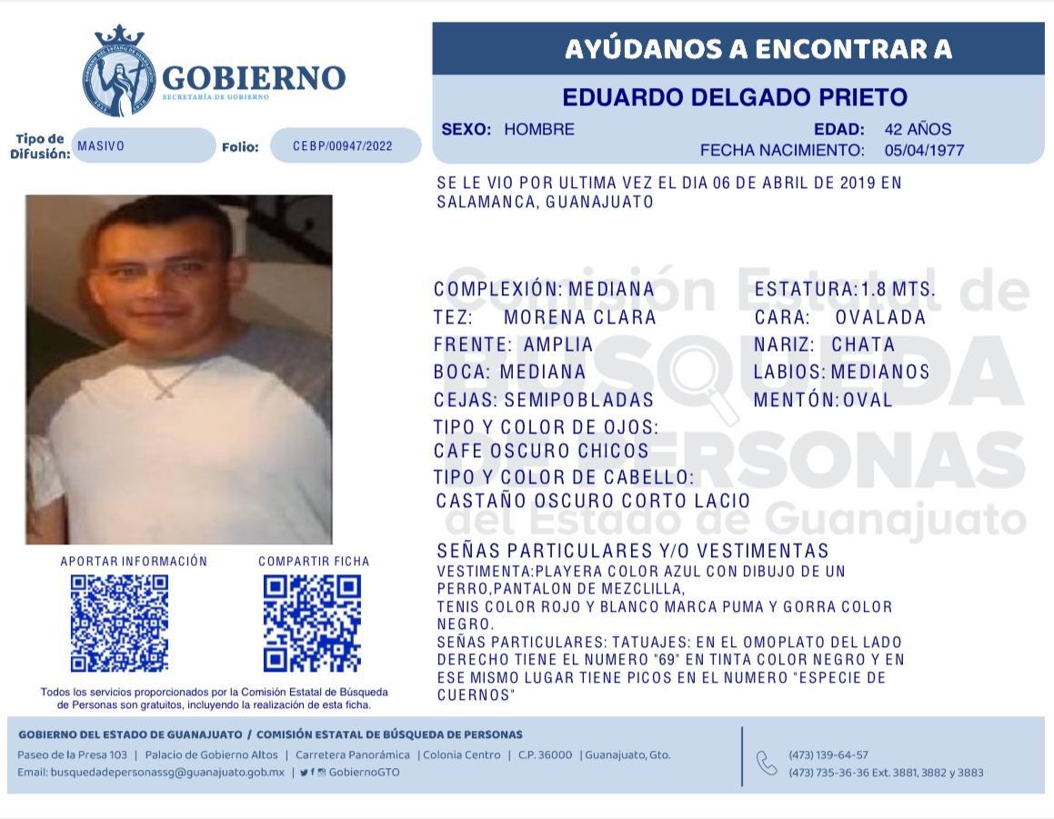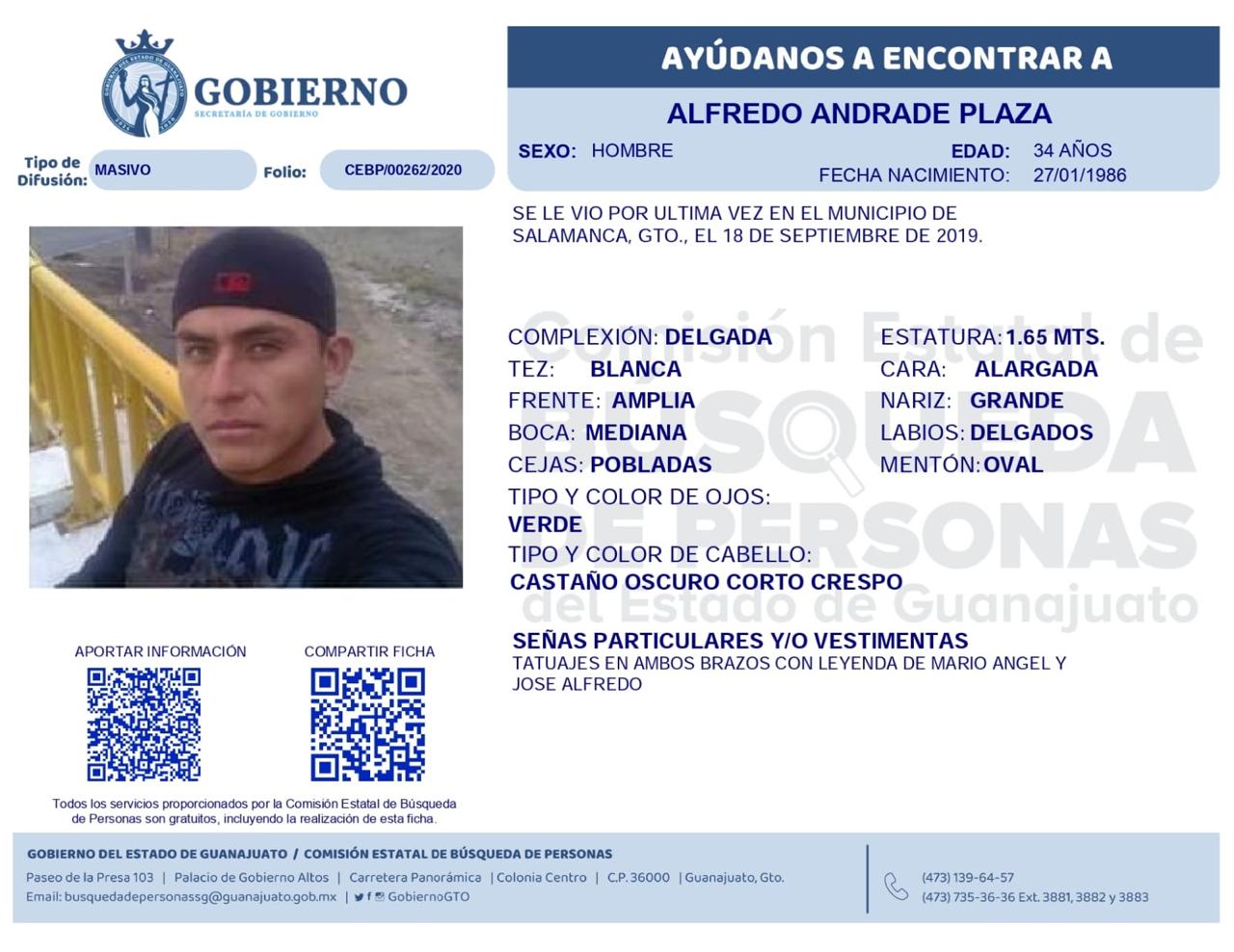 También es buscado Eduardo Delgado Prieto de 42 años de edad, quien por última vez fue visto el 6 de abril del 2019 en esta ciudad y finalmente, Alfredo Andrade Plaza de 34 años de edad, visto por última ocasión en este municipio el 18 de septiembre del 2019.