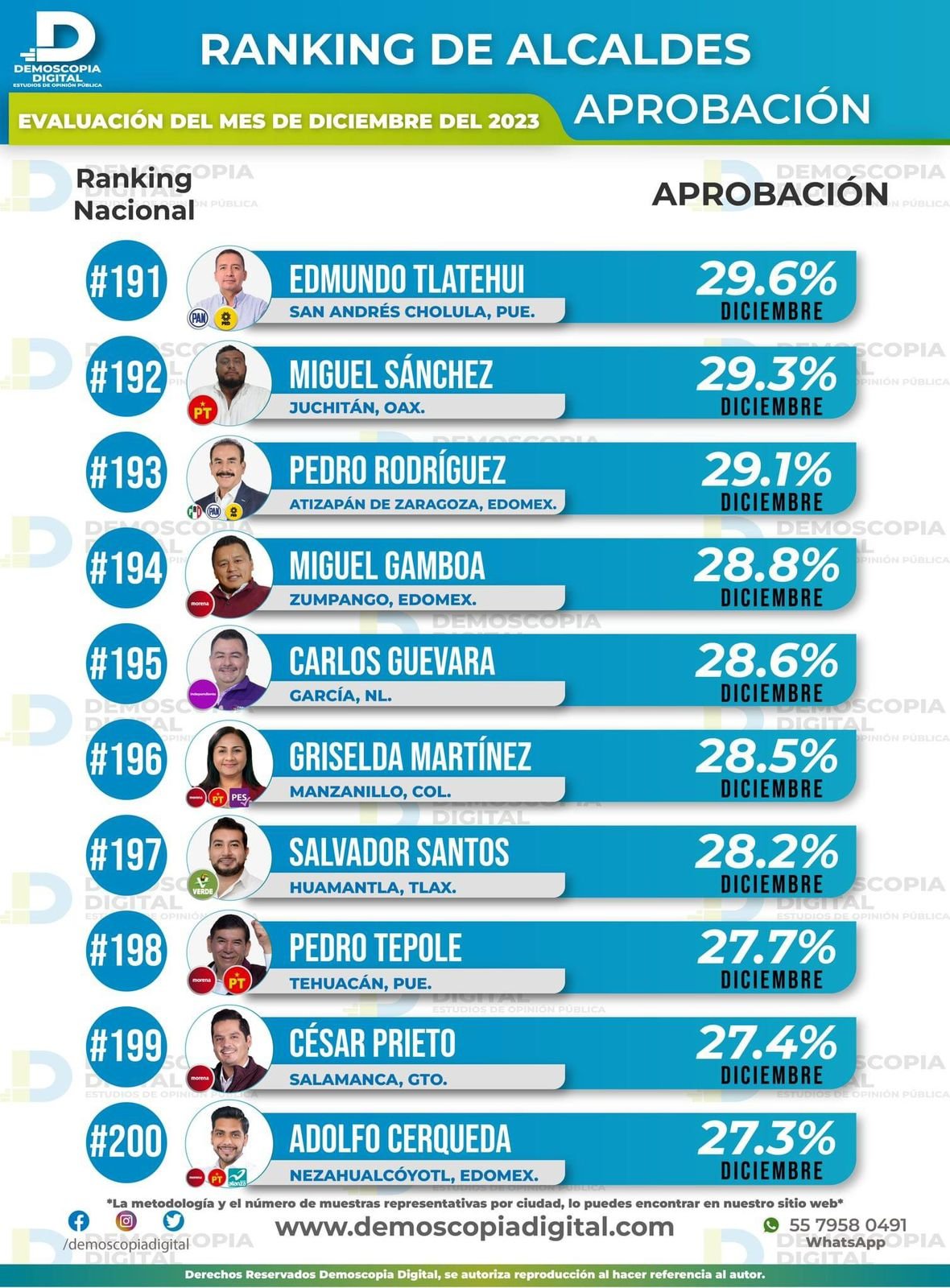 Los datos fueron publicados por la empresa encuestadora, Demoscopia Digital, la cual lleva cabo el llamado Ranking de alcaldes del país en el cual fueron incluidos 210 presidentes municipales de todo el país.