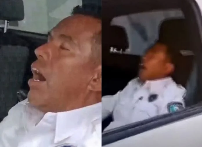 Con todo y el uniforme, el elemento estaba profundamente dormido y con la boca abierta; a lo que posteriormente compartiría que pertenece a la policía vial.