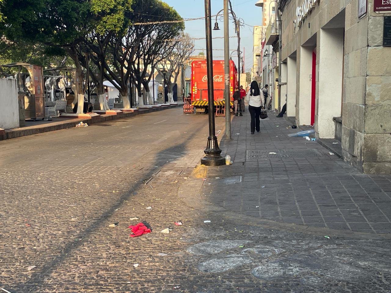 Durante el fin de semana, las calles Juárez, Revolución, Zaragoza, Hidalgo, 5 de Mayo, Tomasa Esteves, Andrés Delgado y Albino García, así como la plaza Miguel Hidalgo y el Jardín Principal, lucieron llenos de desechos, botellas y envolturas. De acuerdo con personal de Servicios Públicos Municipales, fue necesario duplicar e incluso triplicar las cuadrillas de limpieza para restablecer la imagen del centro histórico.