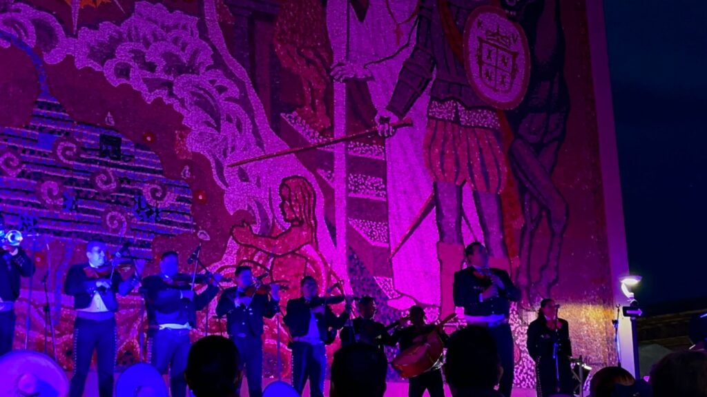 Fue bajo el mural de La Identidad, creado por el pintor Salvador Almaraz, que se dieron cita los asistentes así como los grupos musicales, quienes deleitaron a todos con un gran sonido y juego de luces.