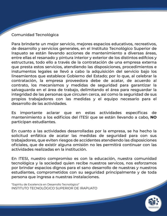 Después de que se dieran a conocer algunos reportes en las redes sociales por parte de alumnos del Instituto Tecnológico Superior de Irapuato (ITESI), donde señalaban no contar con medidas y equipo de protección para sus labores de servicio social, la institución se ha pronunciado al respecto.