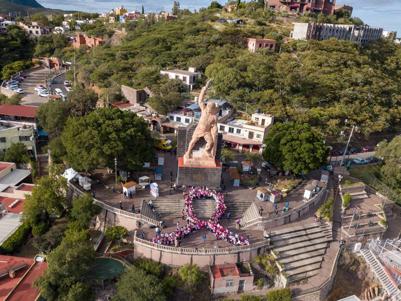 Guanajuato, Gto.; 19 de octubre de 2022.- Un grupo de 150 personas convocadas por Samantha Smith formó un moño rosa gigante en el mirador de El Pípila, como parte de las conmemoraciones del Día Internacional de la Lucha contra el Cáncer de Mama en la ciudad de Guanajuato.