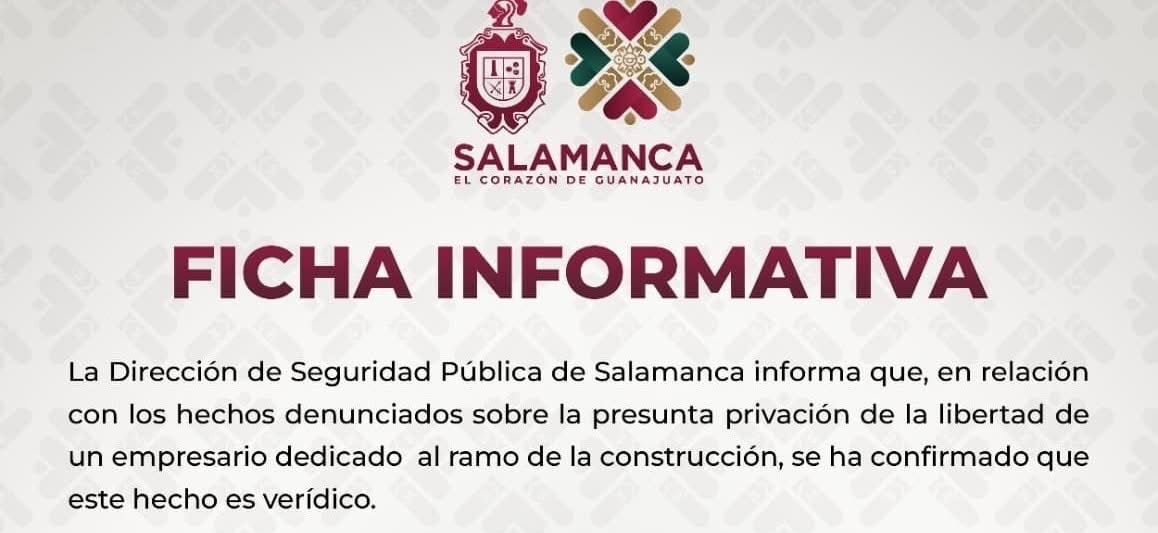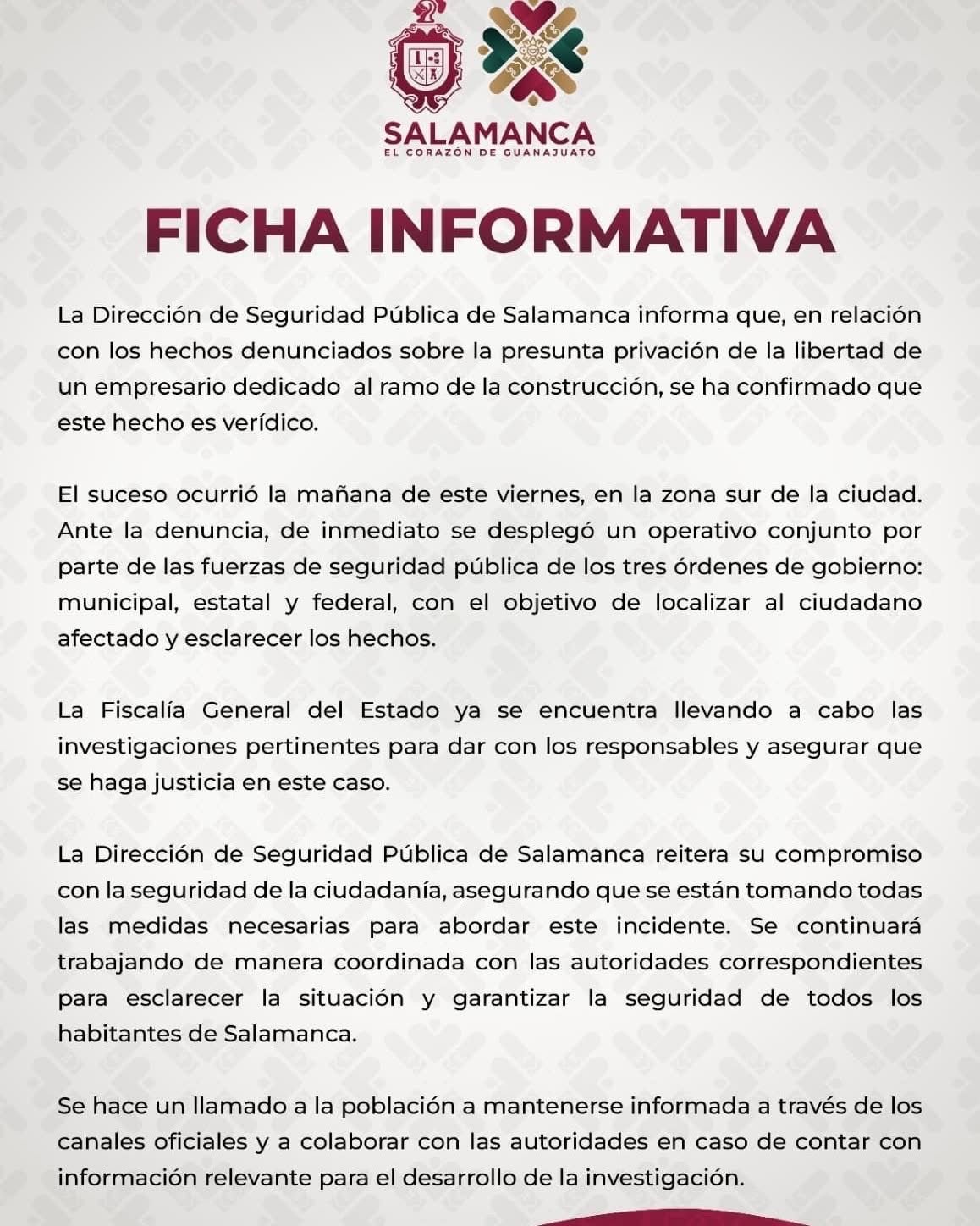 En un comunicado difundido hace un momento, el municipio informó textualmente que “La Dirección de Seguridad Pública de Salamanca informa que, en relación con los hechos denunciados sobre la presunta privación de la libertad de un empresario dedicado al ramo de la construcción, se ha confirmado que este hecho es verídico”.