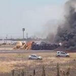 Salamanca.-Daños materiales y un congestionamiento de tráfico vehicular fue el saldo de la volcadura de un trailer que transportaba pacas de rastrojo por el libramiento carretero sur pero se volcó e incendió.