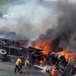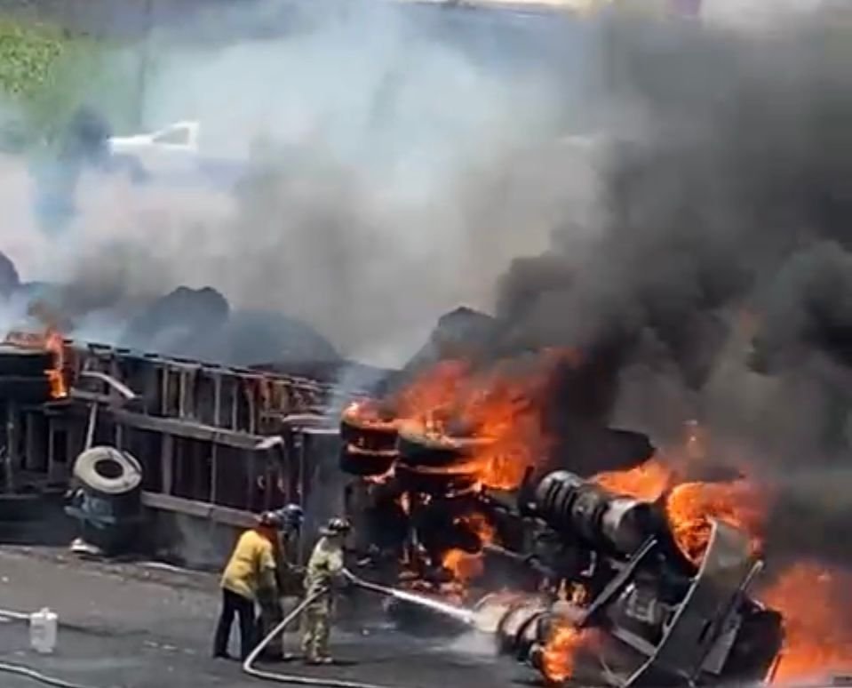 Por la volcadura el tractocamión se incendió y la tripulación del vehículo de carga logró salir.