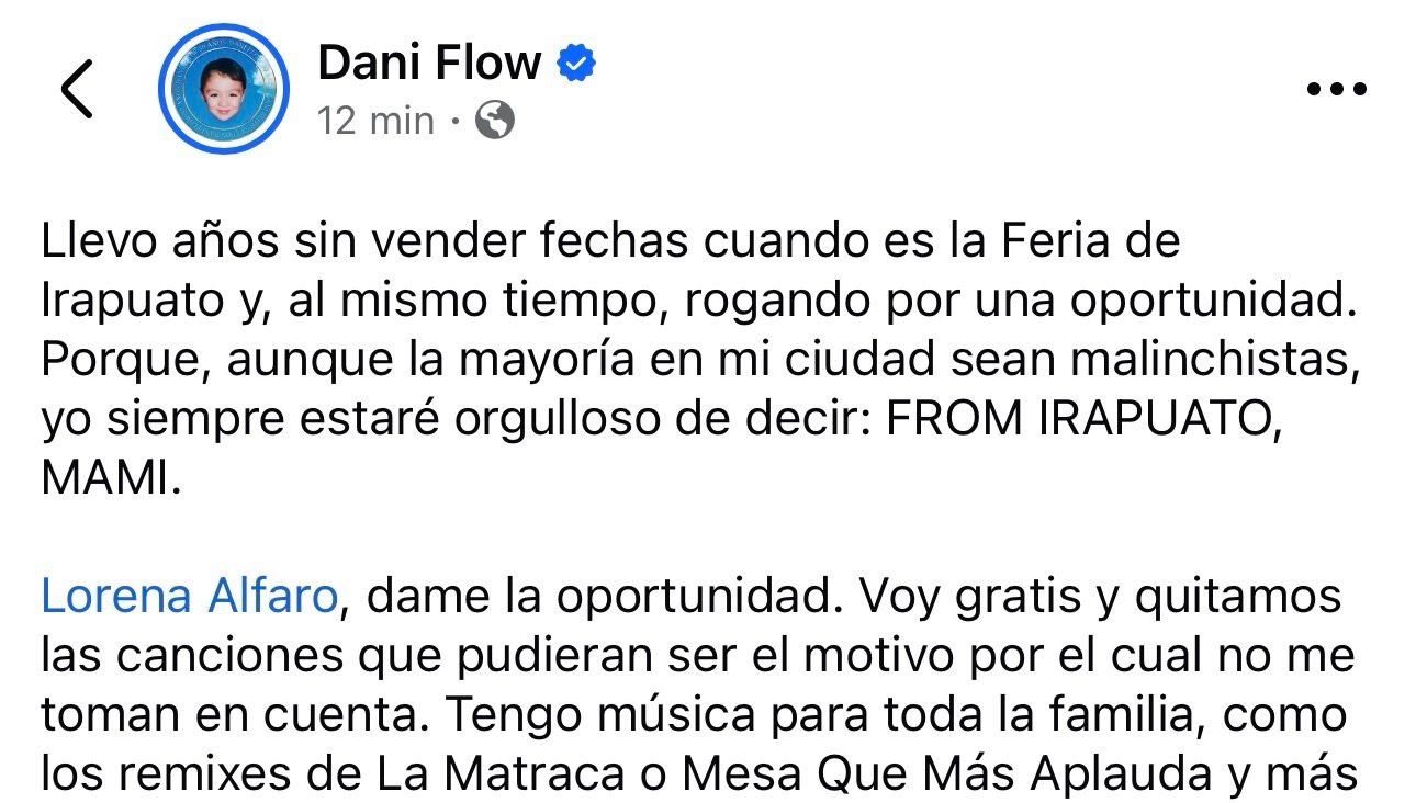 A través de redes sociales, el artista originario de Irapuato afirmó que lleva años sin ser contratado durante la Feria, a pesar de solicitar oportunidades de manera constante, y reiteró su orgullo por sus raíces. “Aunque muchos sean malinchistas, yo siempre diré: from Irapuato, mami”, expresó.
