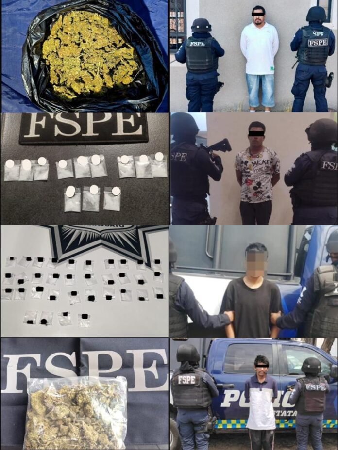 Como resultado de un operativo realizado en el municipio de Villagrán, en la comunidad de El Rehilete, se detuvo a un masculino con 400 dosis de marihuana; en Pueblo Nuevo, se detuvo a un masculino con 30 dosis de drogas sintéticas en la comunidad Presa Grande; y se detuvo a un a masculino con 50 dosis de marihuana, en la colonia Lázaro Cárdenas, en el municipio de San Luis de la Paz.