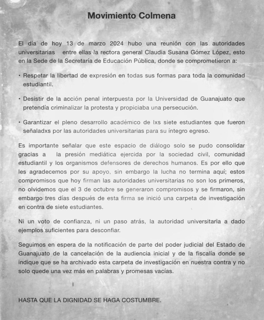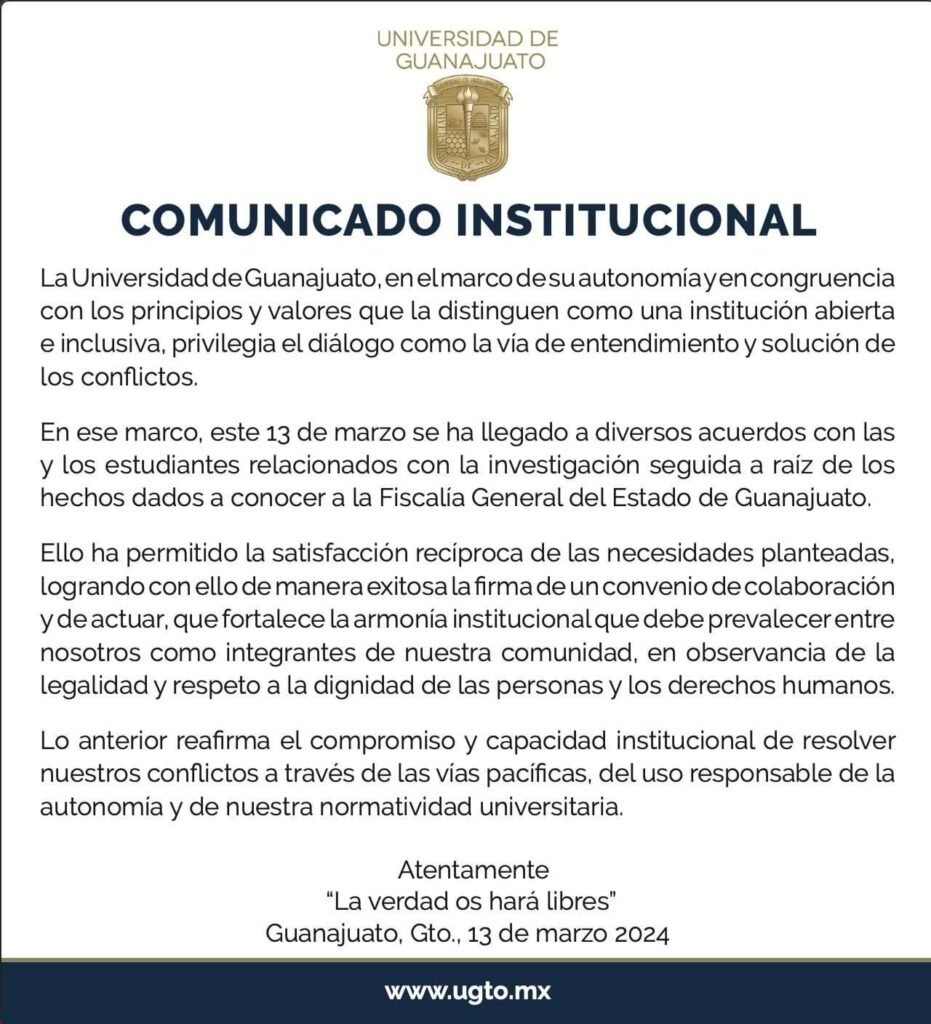 “Este 13 de marzo se ha llegado a diversos acuerdos con las y los estudiantes relacionados con la investigación seguida a raíz de los hechos dados a conocer a la Fiscalía General del Estado de Guanajuato”.