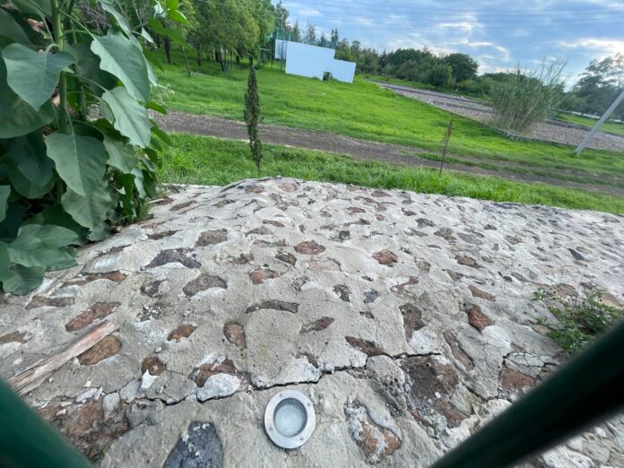 Al recorrer la obra, que no es bardeado sino malla, el suelo que fue nivelado, compactado y finalmente cubierto con el cemento y rocas.