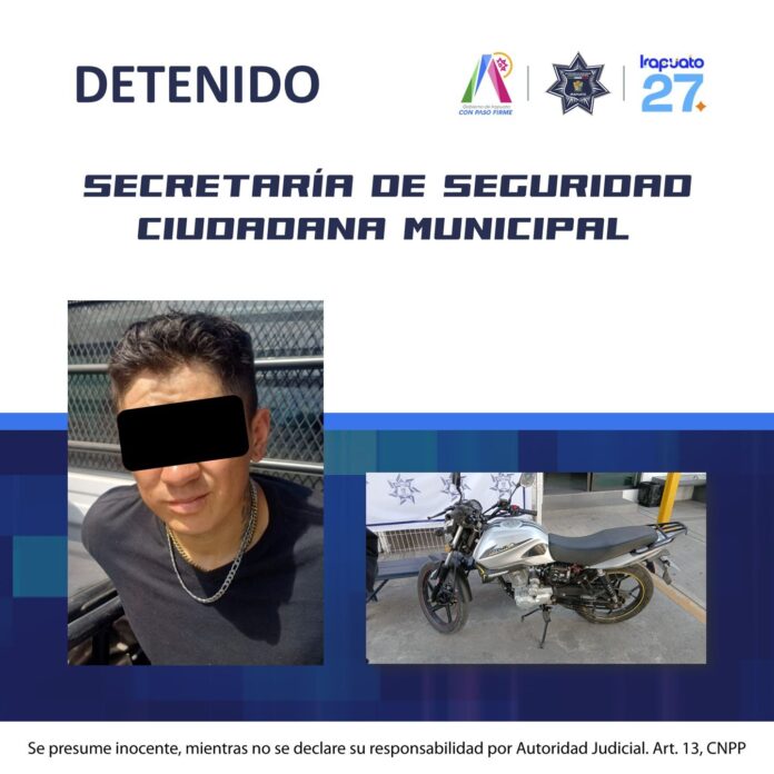 La detención se llevó a cabo en avenida Mariano J. García, en la colonia San Miguelito, donde agentes municipales marcaron el alto a un sujeto que circulaba en una motocicleta Italika sin placas ni casco. Tras la verificación en bases policiales, se confirmó que la unidad contaba con reporte de robo vigente.