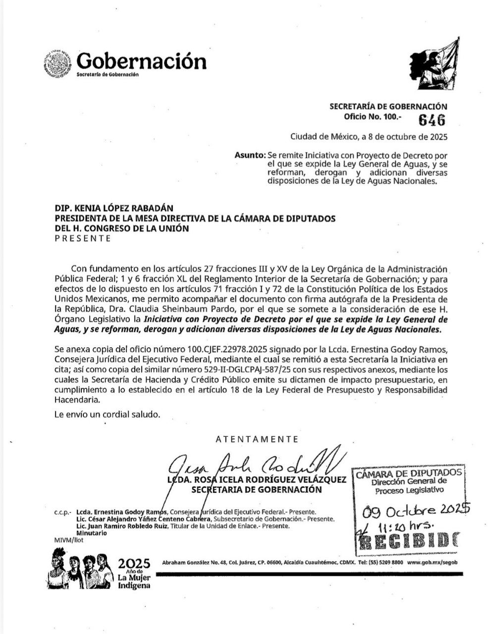 La Cámara de Diputados recibió formalmente una iniciativa del Ejecutivo para expedir la Ley General de Aguas y reformar la Ley de Aguas Nacionales, con el propósito de fortalecer el derecho humano al agua y combatir prácticas irregulares en concesiones hídricas. ⚖️