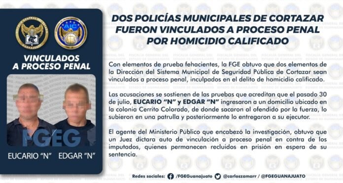 Con elementos de prueba fehacientes, la FGE obtuvo que dos elementos de la Dirección del Sistema Municipal de Seguridad Pública de Cortazar sean vinculados a proceso penal, inculpados en el delito de homicidio calificado.