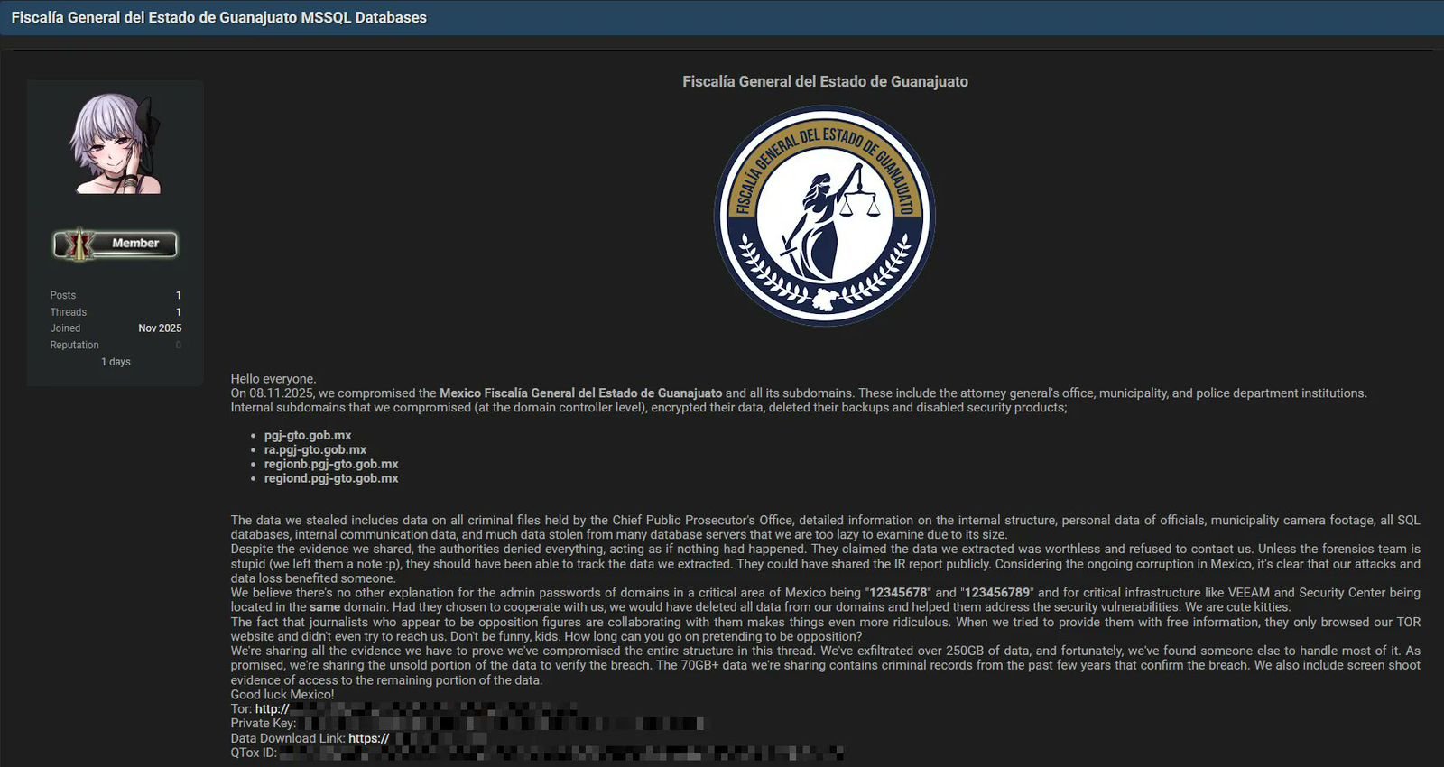 Una presunta célula turca de hackeo (Tekir APT), filtró esta semana al menos 10 gigabytes de información, que habría extraído de la base de datos de la Fiscalía General de Guanajuato hace dos semanas. Estos incluirían expedientes judiciales, bases de datos SQL, credenciales, comunicaciones internas y grabaciones de las regionales. Pero la autoridad aún lo minimiza.
