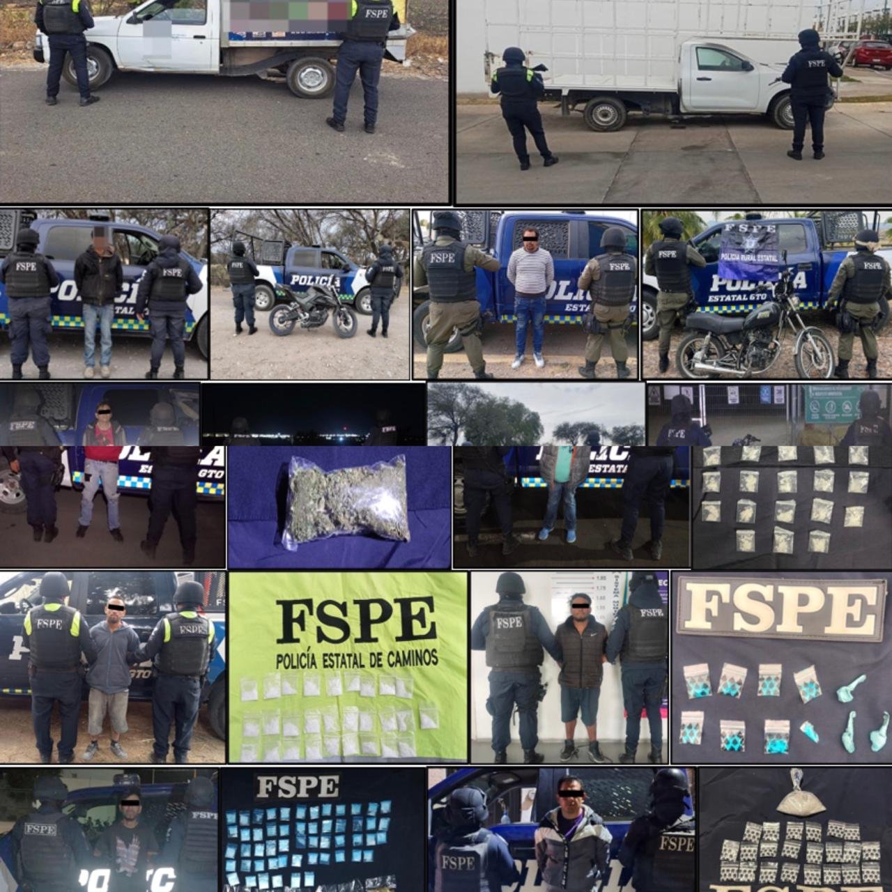 En la calle La Paz, en la colonia Ignacio Ramírez, en San Miguel de Allende, se detuvo a un masculino con 31 dosis de marihuana; y en el fraccionamiento Insurgentes, se puso a disposición a un masculino con 105 dosis de drogas sintéticas; también se recuperó mercancía consistente en 10 tarimas con rollos de plástico para emplayar, con un valor aproximado a los 100 mil pesos, esto sobre la carretera estatal 77 Silao – San Felipe.