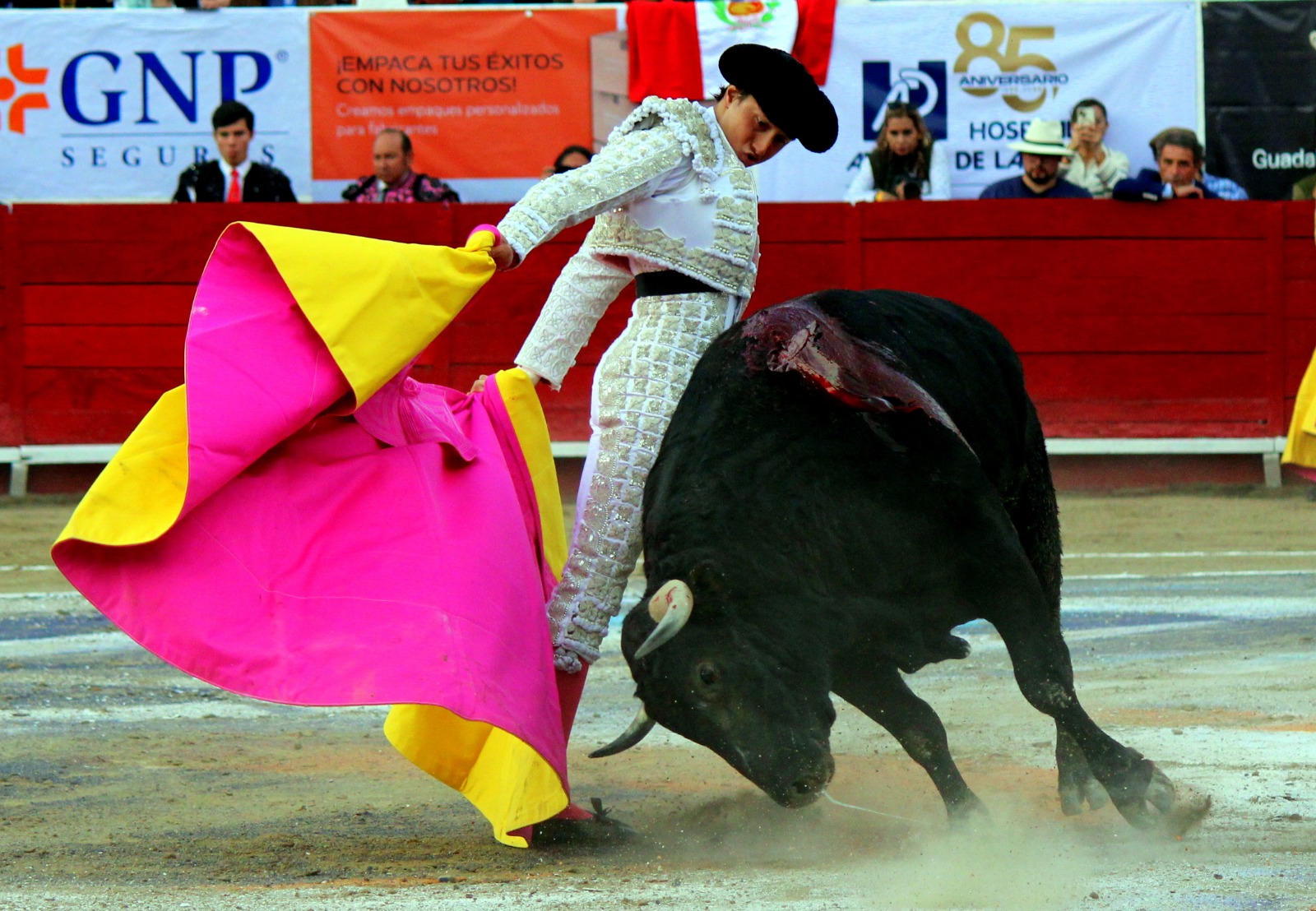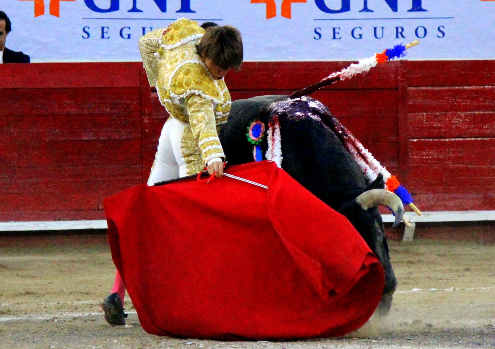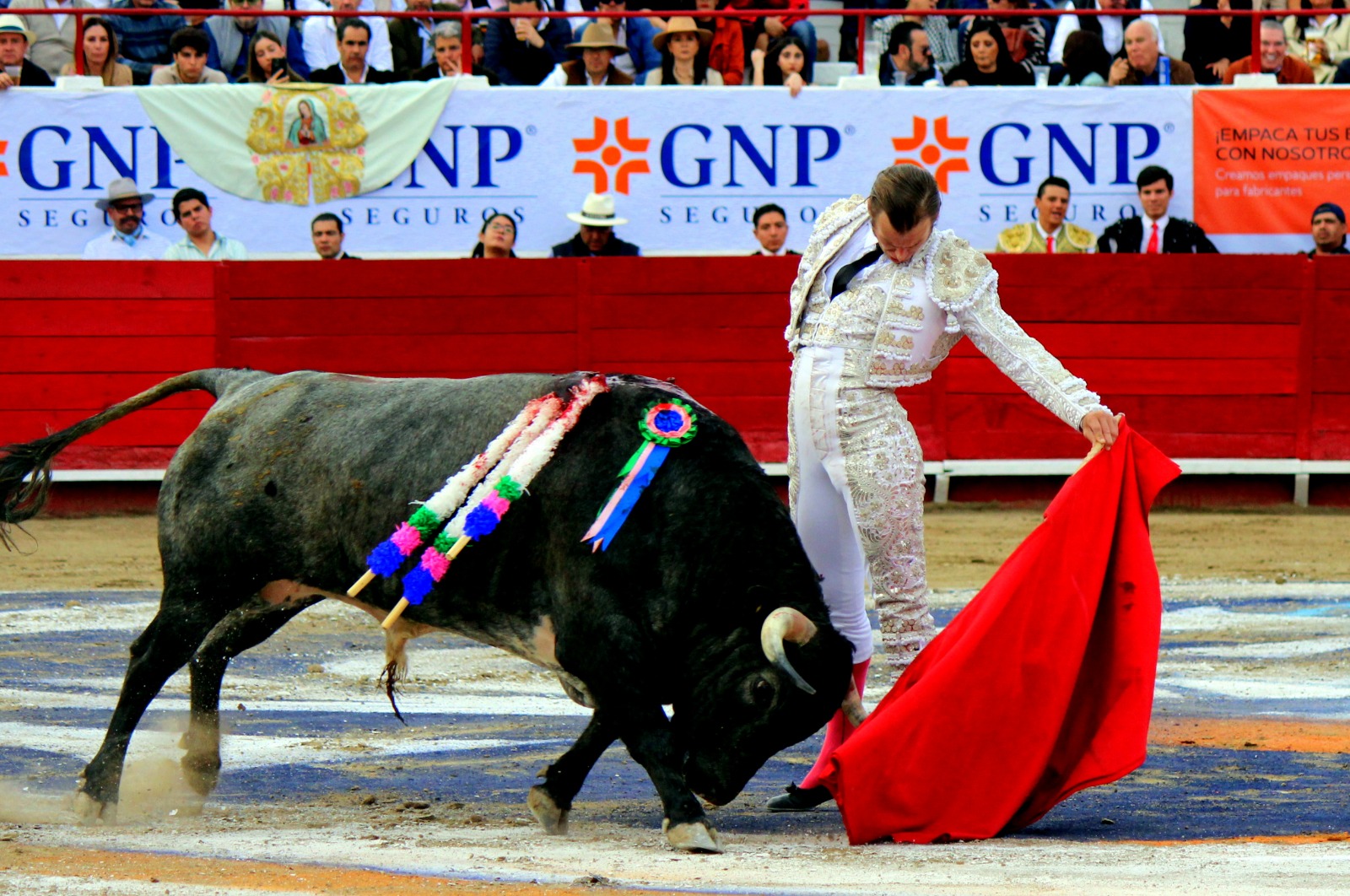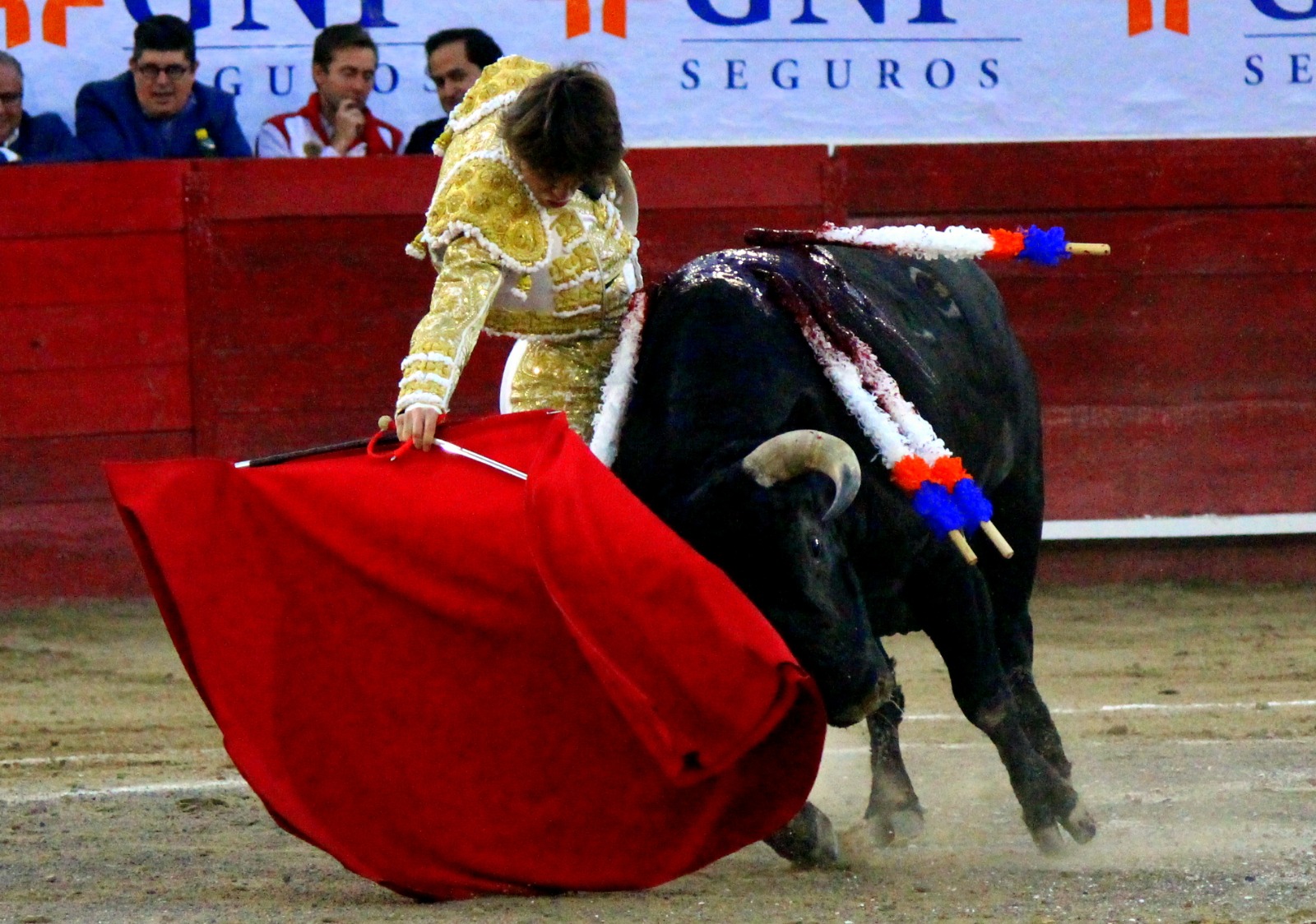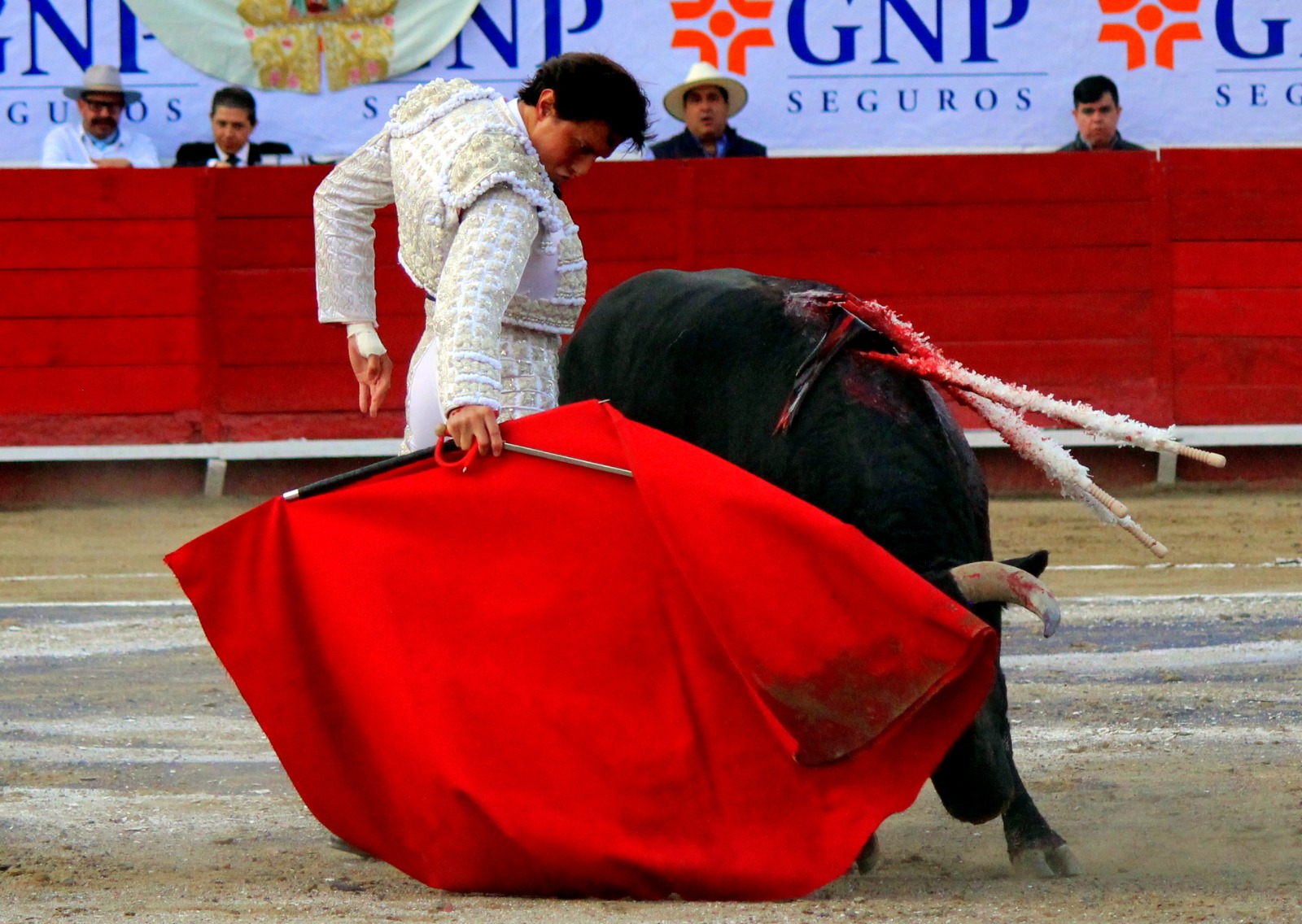 El novel espada Arturo Gilio salió al ruedo dispuesto a triunfar y no dejarse ganar por sus alternantes, por muy figuras que fueran, por eso a su primero lo fue toreando con mucha torería desde el capote arrancando por ello los olés con mucha fuerza, después con la moleta le bordó tandas al noble toro por la derecha a izquierda en redondo y con mucho temple, la gente todo le coreaba y luego cuando se fue por derecho dejando un estoconazo, fue levantado en vilo con el pitó derecho cayendo por fortuna de pie, pero se dolía mucho del costado izquierdo. Al parecer sufrió fractura de costillas. Las 2 orejas como premio le dieron y con ellas recorrió el ruedo haciendo gestos de dolor. Se temía que ya no iba a salir Gilio de la enfermería, pero el chaval en un gesto de pundonor y vergüenza torera, salió ya sin la casaquilla y de rodillas con el capote recibió al segundo de su lote por verónicas y ya de pie pegó unas chicuelinas y con la muleta comenzó con cambiados por la espalda a medio ruedo, después a correr la mano en derechazos y naturales muy toreros y templados con remates, todo ante la algarabía de la gente que conectó mucho con él, por eso cuando se tiró a matar y dejó una media y después un descabello, le dieron otra oreja entre gritos de torero torero. Al final salió junto con Roca Rey a hombros de la plaza, pero directo al hospital.