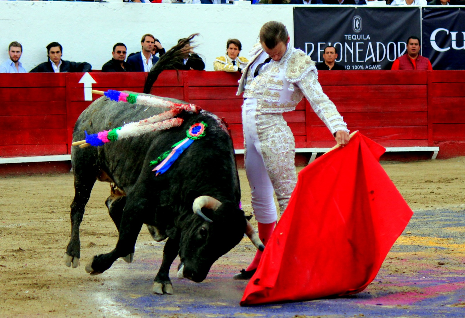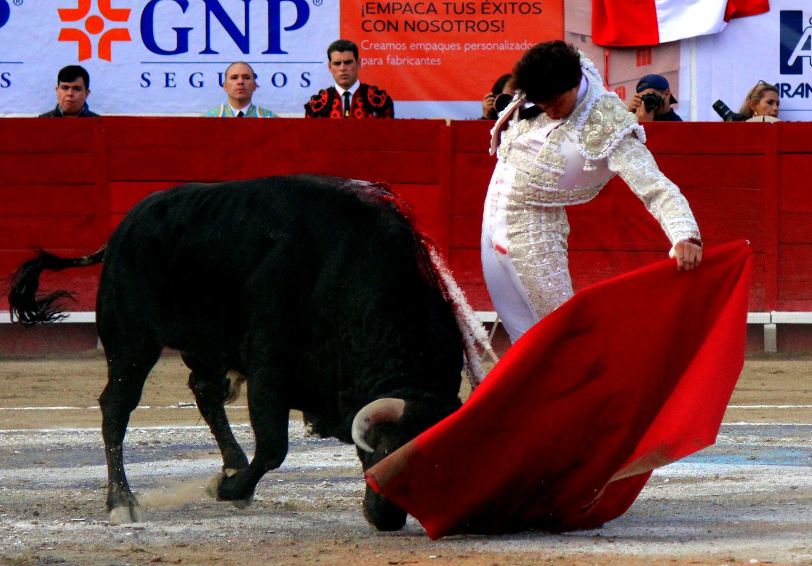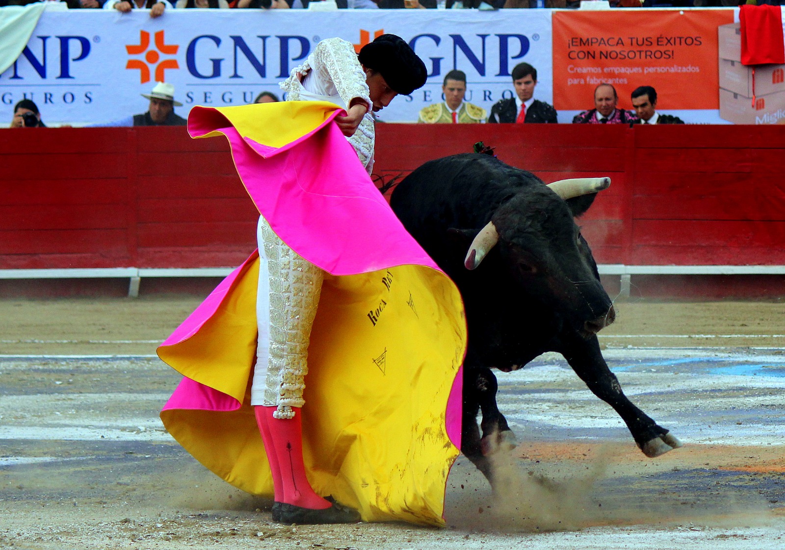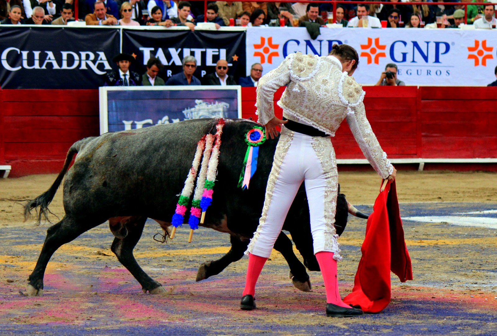 El novel espada Arturo Gilio salió al ruedo dispuesto a triunfar y no dejarse ganar por sus alternantes, por muy figuras que fueran, por eso a su primero lo fue toreando con mucha torería desde el capote arrancando por ello los olés con mucha fuerza, después con la moleta le bordó tandas al noble toro por la derecha a izquierda en redondo y con mucho temple, la gente todo le coreaba y luego cuando se fue por derecho dejando un estoconazo, fue levantado en vilo con el pitó derecho cayendo por fortuna de pie, pero se dolía mucho del costado izquierdo. Al parecer sufrió fractura de costillas. Las 2 orejas como premio le dieron y con ellas recorrió el ruedo haciendo gestos de dolor. Se temía que ya no iba a salir Gilio de la enfermería, pero el chaval en un gesto de pundonor y vergüenza torera, salió ya sin la casaquilla y de rodillas con el capote recibió al segundo de su lote por verónicas y ya de pie pegó unas chicuelinas y con la muleta comenzó con cambiados por la espalda a medio ruedo, después a correr la mano en derechazos y naturales muy toreros y templados con remates, todo ante la algarabía de la gente que conectó mucho con él, por eso cuando se tiró a matar y dejó una media y después un descabello, le dieron otra oreja entre gritos de torero torero. Al final salió junto con Roca Rey a hombros de la plaza, pero directo al hospital.