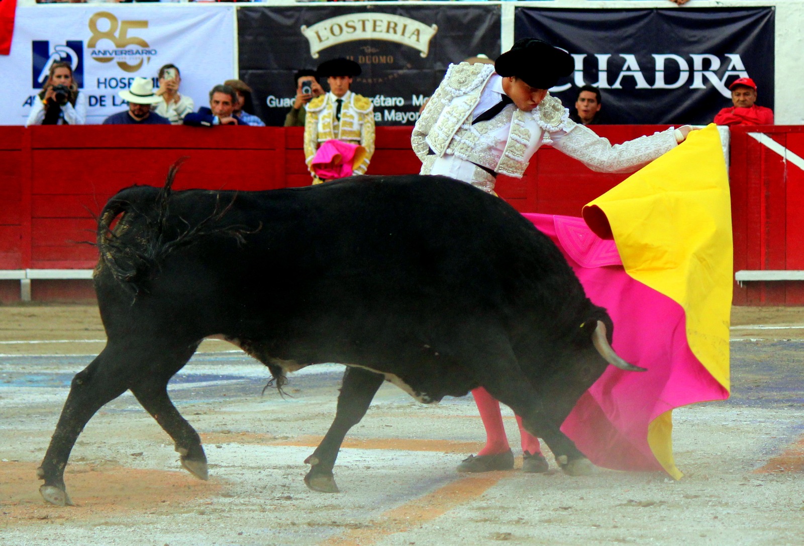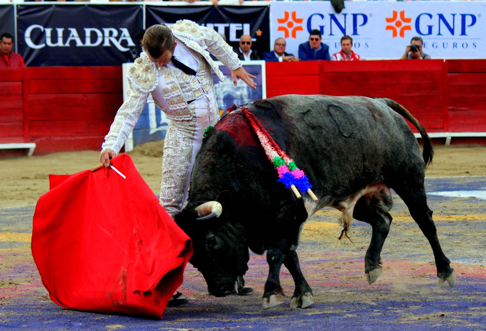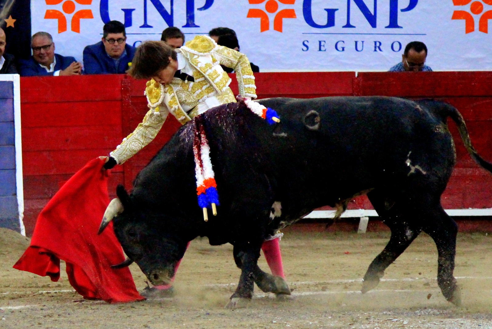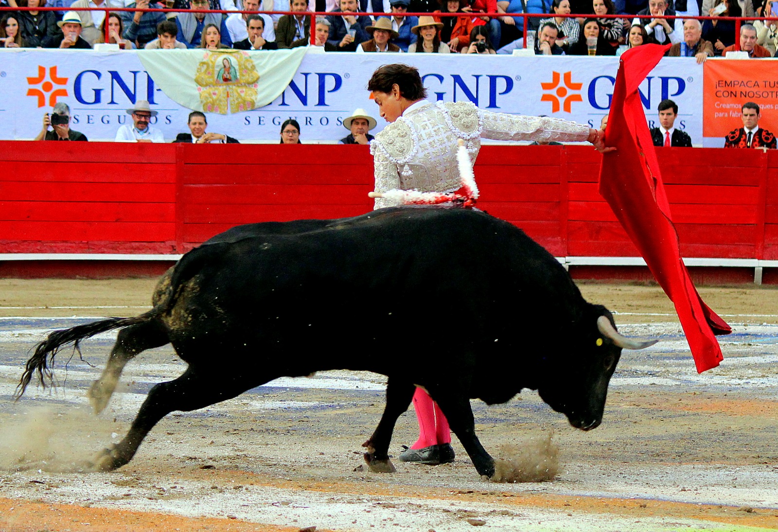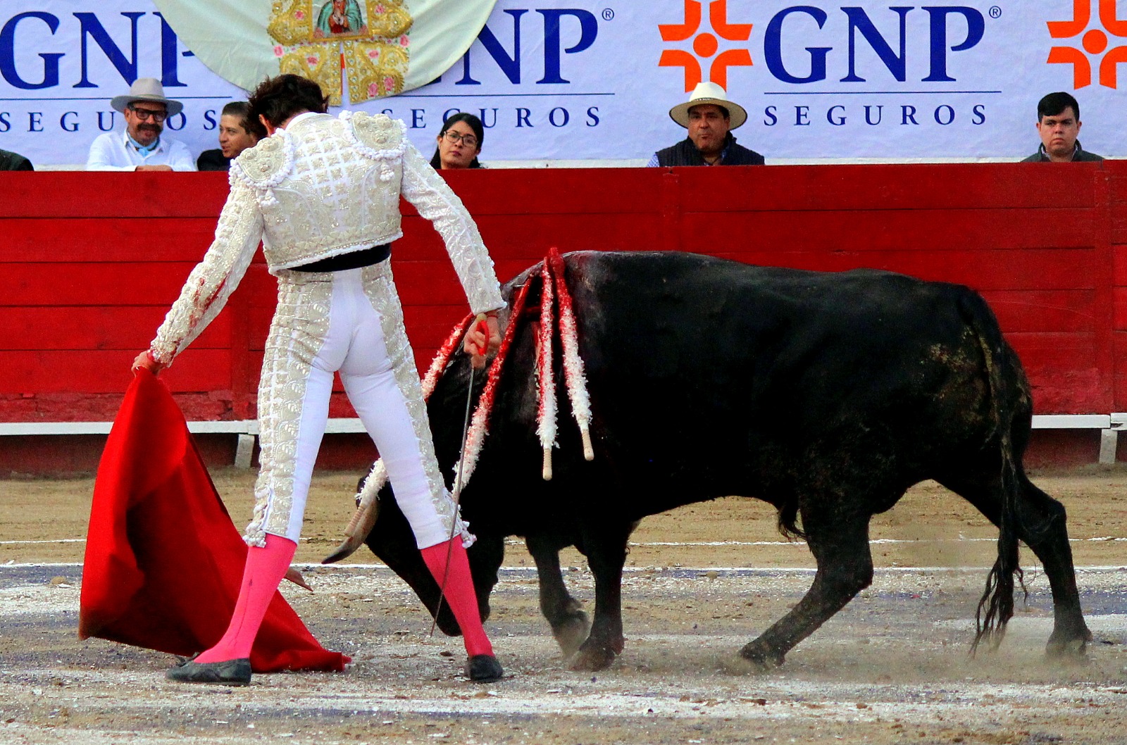 El novel espada Arturo Gilio salió al ruedo dispuesto a triunfar y no dejarse ganar por sus alternantes, por muy figuras que fueran, por eso a su primero lo fue toreando con mucha torería desde el capote arrancando por ello los olés con mucha fuerza, después con la moleta le bordó tandas al noble toro por la derecha a izquierda en redondo y con mucho temple, la gente todo le coreaba y luego cuando se fue por derecho dejando un estoconazo, fue levantado en vilo con el pitó derecho cayendo por fortuna de pie, pero se dolía mucho del costado izquierdo. Al parecer sufrió fractura de costillas. Las 2 orejas como premio le dieron y con ellas recorrió el ruedo haciendo gestos de dolor. Se temía que ya no iba a salir Gilio de la enfermería, pero el chaval en un gesto de pundonor y vergüenza torera, salió ya sin la casaquilla y de rodillas con el capote recibió al segundo de su lote por verónicas y ya de pie pegó unas chicuelinas y con la muleta comenzó con cambiados por la espalda a medio ruedo, después a correr la mano en derechazos y naturales muy toreros y templados con remates, todo ante la algarabía de la gente que conectó mucho con él, por eso cuando se tiró a matar y dejó una media y después un descabello, le dieron otra oreja entre gritos de torero torero. Al final salió junto con Roca Rey a hombros de la plaza, pero directo al hospital.