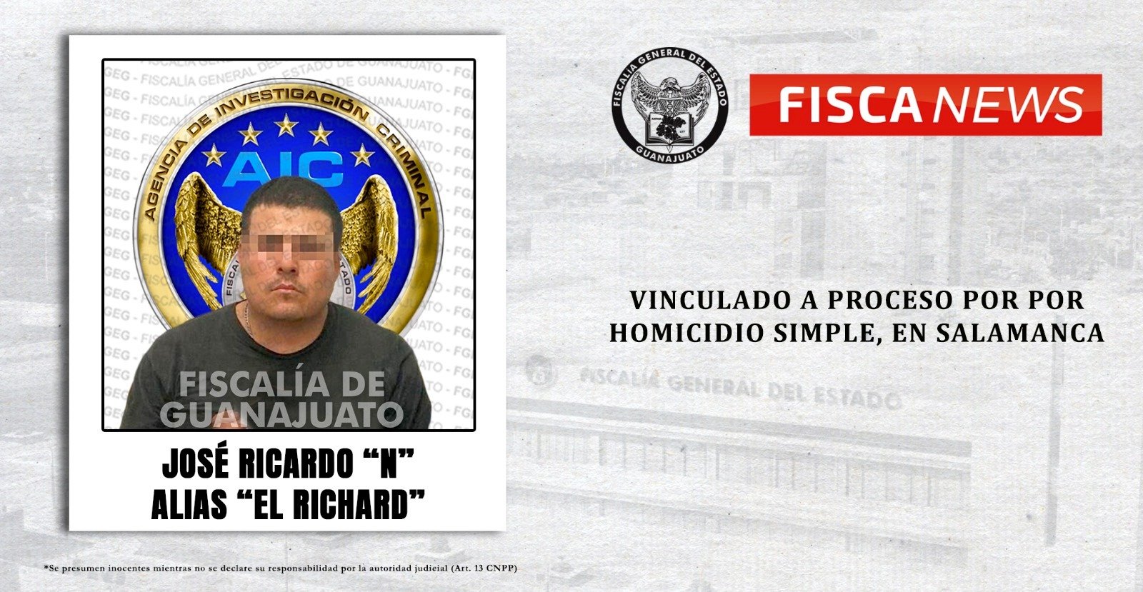 Con la presentación de los medios legales y la exactitud probatoria de un hecho que hacen presumir su intervención y responsabilidad en el delito de homicidio, la Fiscalìa General del Estado obtuvo vinculación a proceso en contra de JOSÈ RICARDO “N”. Este sujeto accionó un arma de fuego en contra de Jesùs Fernando “N”, la madrugada del 28 de octubre de 2020, cuando ambos se encontraban afuera de un domicilio en la calle Santa Mònica, en la colonia La Gloria.