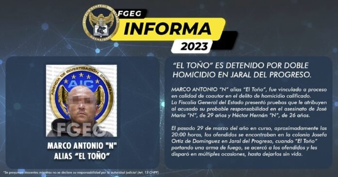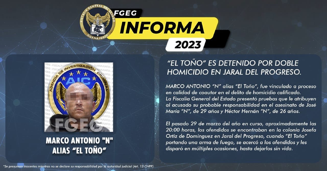 El pasado 29 de marzo del año en curso, aproximadamente las 20:00 horas, los ofendidos se encontraban en la colonia Josefa Ortiz de Domínguez en Jaral del Progreso, cuando “El Toño” portando una arma de fuego, se acercó a los ofendidos y les disparó en múltiples ocasiones, hasta dejarlos sin vida.