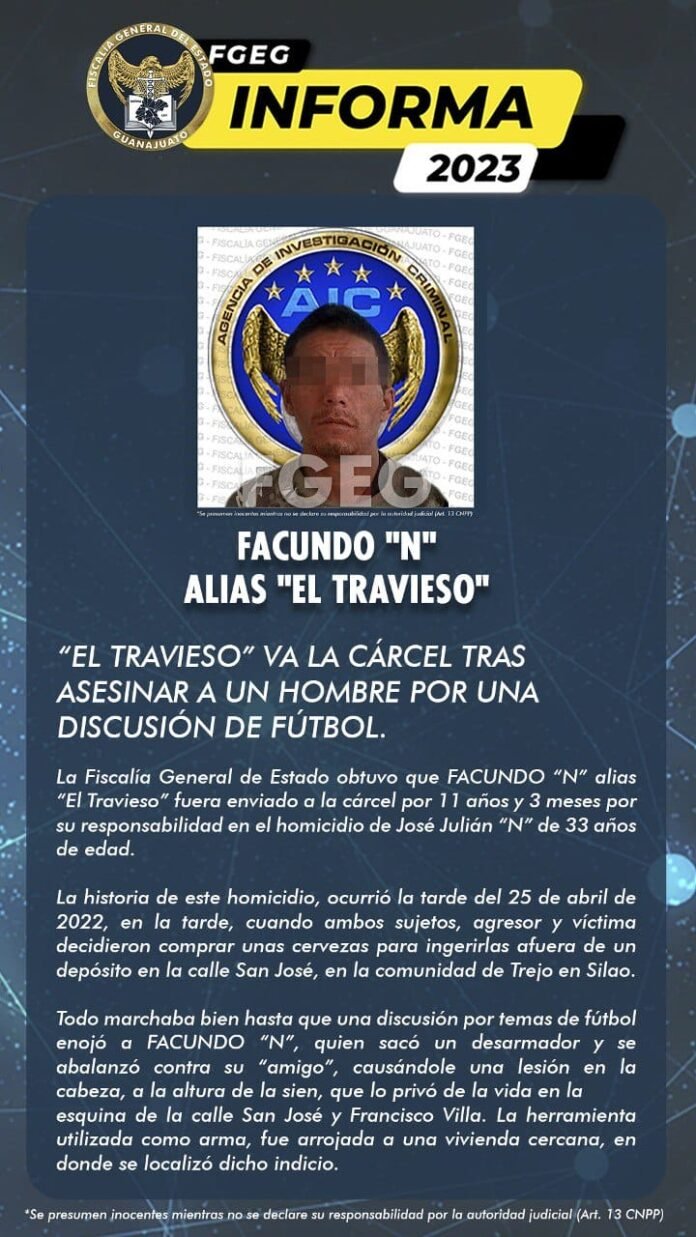 La Fiscalía General de Estado obtuvo que FACUNDO “N” alias “El Travieso” fuera enviado a la cárcel por 11 años y 3 meses por su responsabilidad en el homicidio de José Julián “N” de 33 años de edad.