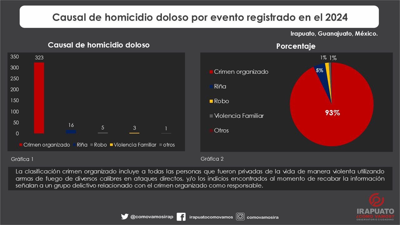 En comparación con 2023, cuando se reportaron 315 eventos y 399 víctimas, el aumento en el número de homicidios y de personas afectadas confirma un deterioro en la situación de seguridad. Este incremento pone en evidencia la falta de eficacia de las estrategias implementadas para combatir la violencia en Irapuato.