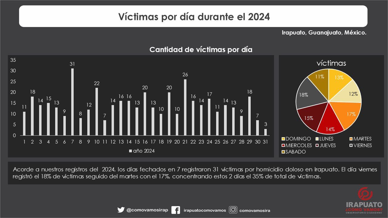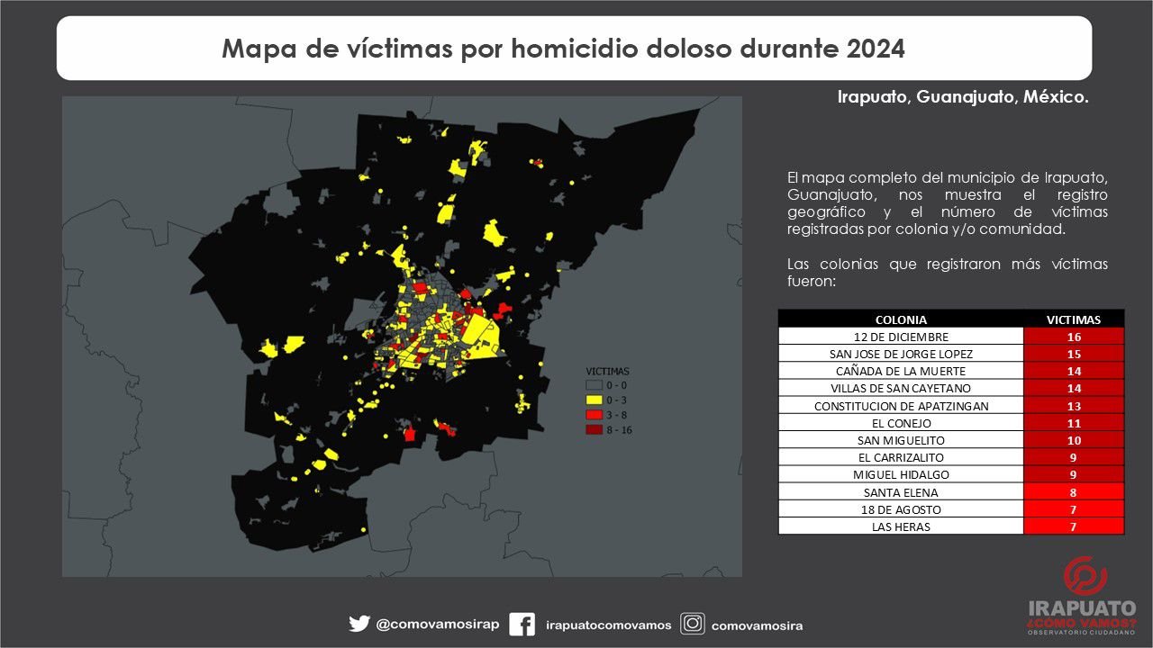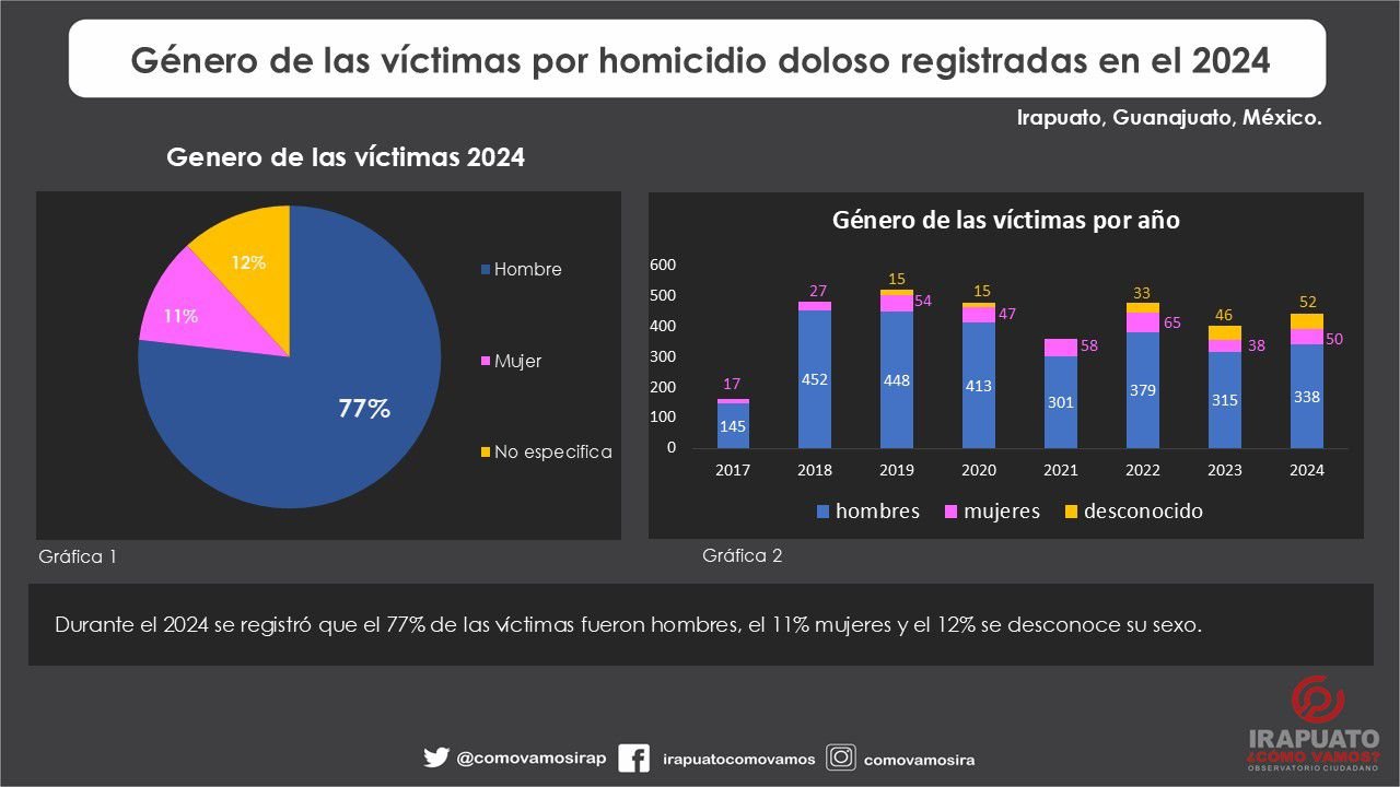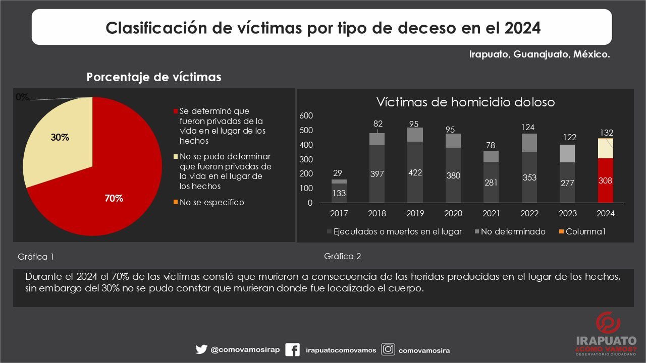 El municipio de Irapuato registró un aumento de homicidios dolosos en 2024. Según el informe anual del Observatorio Ciudadano Irapuato, ¿cómo vamos?, se registraron 348 incidentes y 440 víctimas, un aumento del que corresponde al diez por ciento respecto a los datos de 2023.