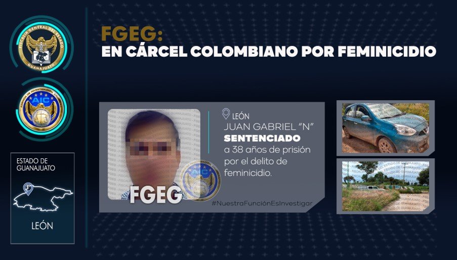 León, Gto., 01 de octubre de 2022.- El hombre de nacionalidad colombiana que asesinó a su expareja, una mujer de 35 años, la tarde del 10 de septiembre de 2020, ha sido sentenciado. La Fiscalía General de Justicia acreditó que el sujeto activo tuvo la intención de privar de la vida a la ofendida, y obtuvo una sentencia de 38 años de cárcel, por el delito de feminicidio.