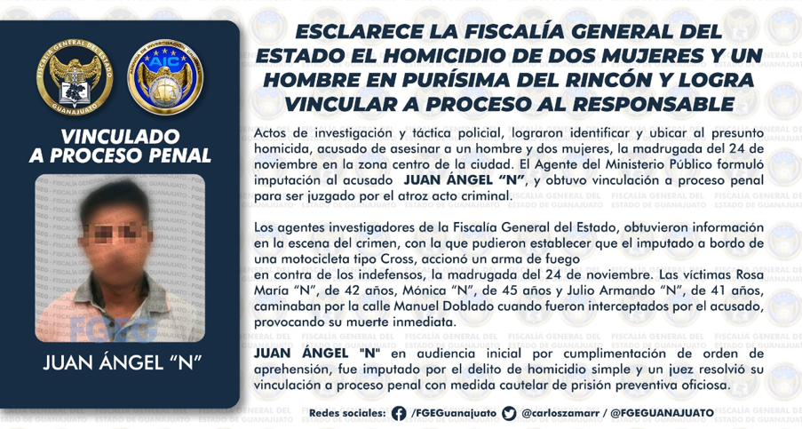 ESCLARECE LA FISCALÍA GENERAL DEL ESTADO EL HOMICIDIO DE DOS MUJERES Y UN HOMBRE EN PURÍSIMA DEL RINCÓN Y LOGRA VINCULAR A PROCESO AL RESPONSABLE.