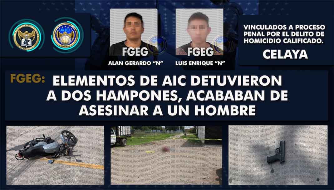 Celaya, Gto. 17 de agosto de 2022. – Dos sujetos que acababan de asesinar a un hombre en la colonia Geovillas de Los Sauces, fueron detenidos por elementos de la Agencia de Investigación Criminal, posteriormente fueron vinculados a proceso penal, en Celaya.