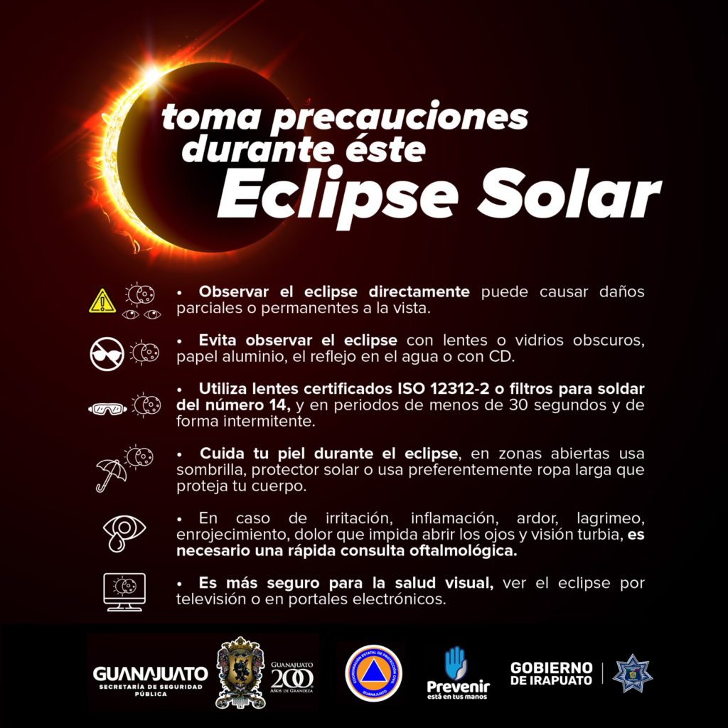 Irapuato, Gto., abril de 2024.- Para prevenir daños en la salud de la ciudadanía como en la vista o la piel durante el eclipse solar del próximo lunes 8 de abril, la Secretaría de Seguridad Ciudadana exhorta a la población a seguir las recomendaciones.