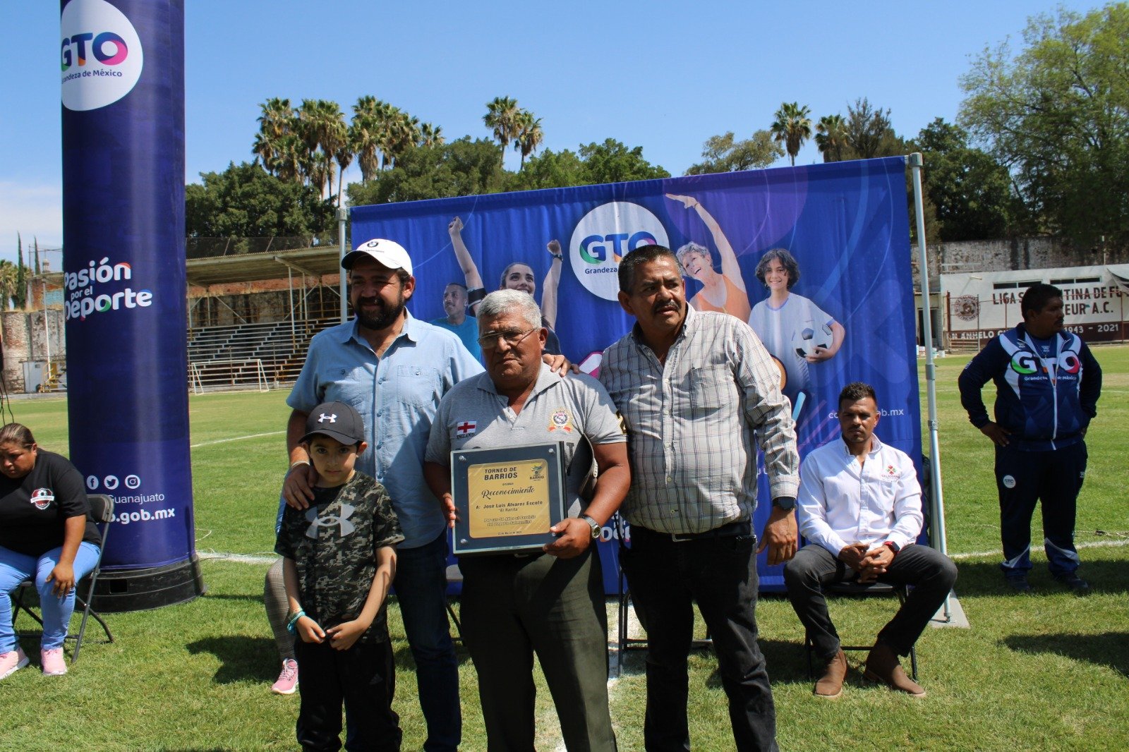 En el acto de inauguración del torneo infantil de fútbol, José Luis Álvarez recibió un reconocimiento por parte de la mesa directiva del Torneo de los Barrios por la enseñanza que dio a los pequeños futbolistas en la organización del evento deportivo.