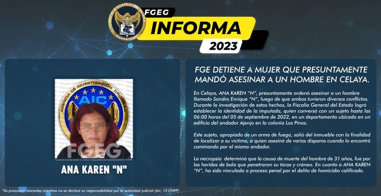 En Celaya, ANA KAREN “N”, presuntamente ordenó asesinar a un hombre llamado Sandro Enrique “N”, luego de que ambos tuvieron diversos conflictos. Durante la investigación de estos hechos, la Fiscalía General del Estado logró establecer la identidad de la imputada, quien conversó con un sujeto hasta las 06:00 horas del 05 de septiembre de 2022, en un departamento ubicado en un edificio del andador Ajenjo en la colonia Los Pinos.