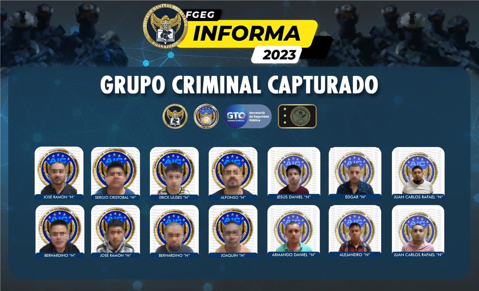 Al incursionar en el inmueble, los agentes detuvieron a 8 personas del sexo masculino, quienes después de ser identificados, se supo que eran oriundos del estado de Jalisco, Guerrero y la ciudad de Abasolo, se trata de: BRAULIO “N”, ALFONSO “N”, JOSÉ RAMÓN “N”, JOSÉ JAIME “N”, BERNARDINO “N”, JOAQUÍN “N”, ERICK ULISES “N” y SERGIO “N”.